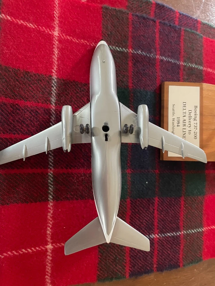 Boeing 737-200 in Vintage Delta Air Lines Livery. Ship N301DL Memento from Delivery Flight SEA-BNA in 1984 Excellent condition but nose wheel is missing. On stand Dimensions 7" nose to tail, 6.5" wingspan