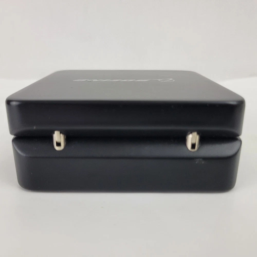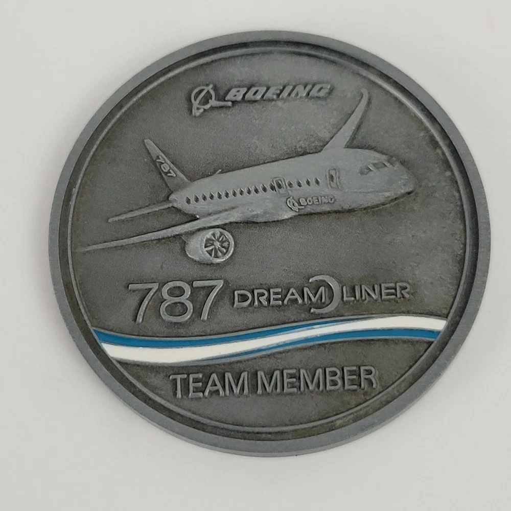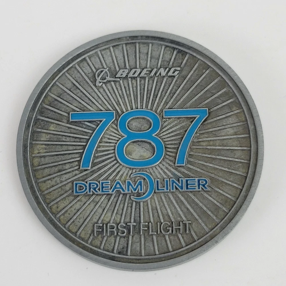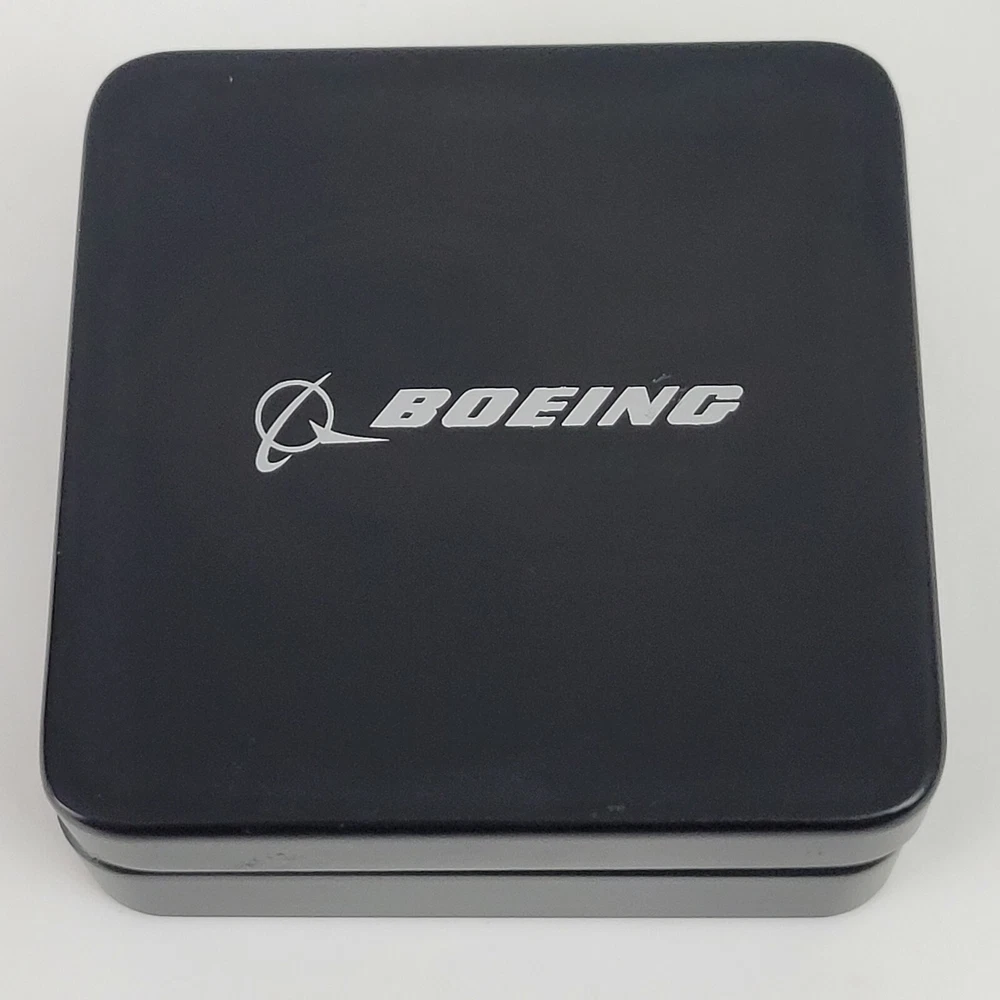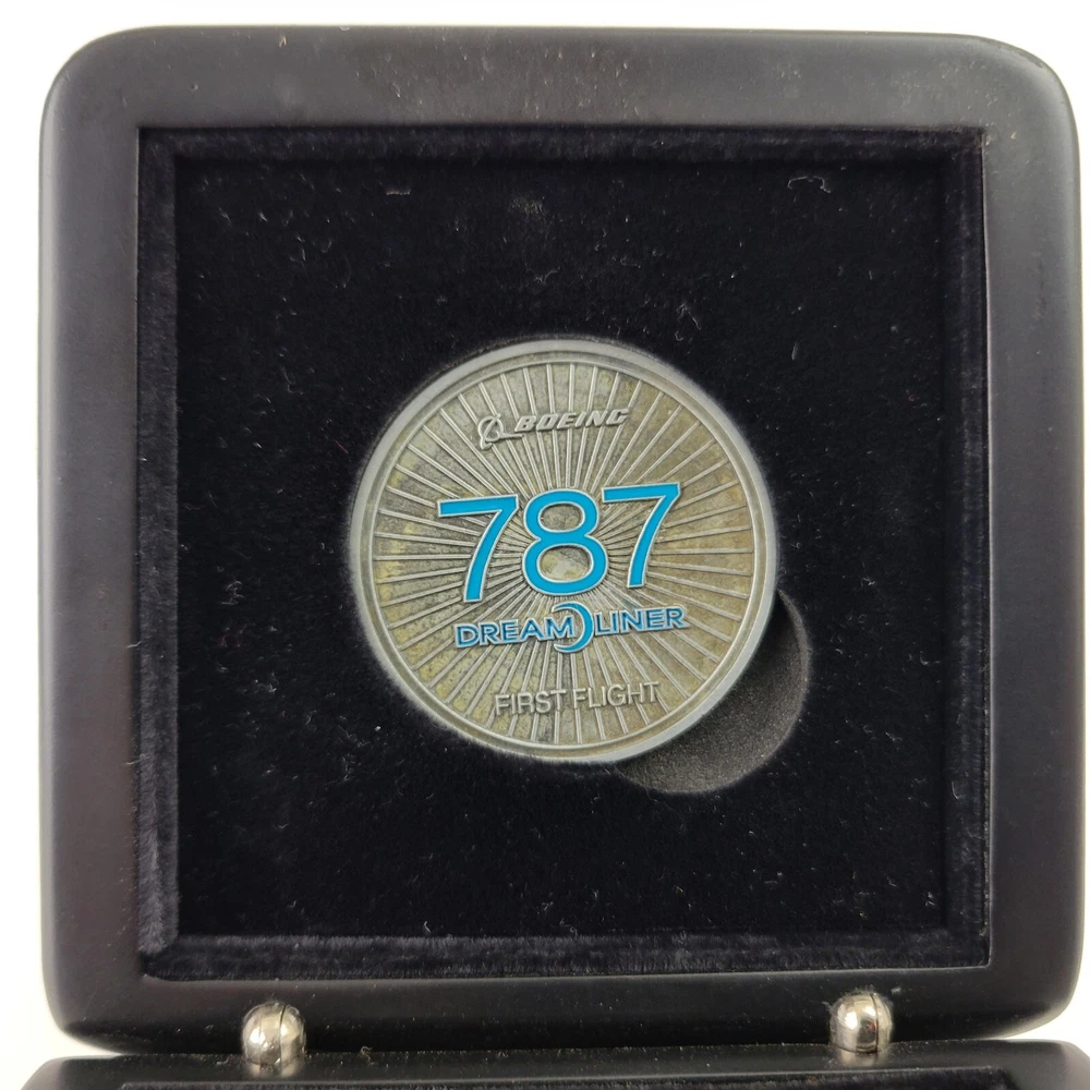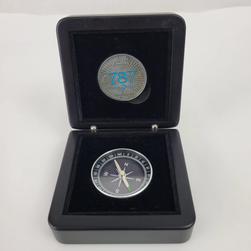 This is a hinged velvet lined case with a 787 First Flight challenge coin and a compass. They are both removable from the case. The challenge coin is 1.5" wide and the compass is 1.75" wide. The case is 3.5" x 3.5" x 1 3/8"
