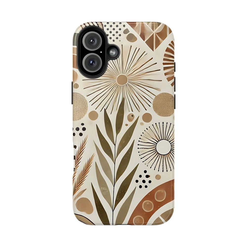 "Boho Chic Mosaic" blends modern bohemian style with a natural earth-toned palette, featuring a mix of geometric shapes, botanical elements, and abstract sunbursts. Protect your phone in custom style with this tough phone case. This lightweight phone case is impact-resistant thanks to its TPU lining and Polycarbonate shell. Meanwhile, the interior rubber liner adds an extra layer of protection to your phone for total peace of mind. Compatible with iPhone and Samsung smartphones. Check sizes for all available phone models. (iPhone 16 model now available). .: Materials: polycarbonate (shell), TPU (lining) .: 2-piece design with impact resistance and shock dispersion .: Interior rubber liner for extra protection (appearance may vary across phone models) .: Glossy finish .: Supports wireless charging (not including MagSafe)