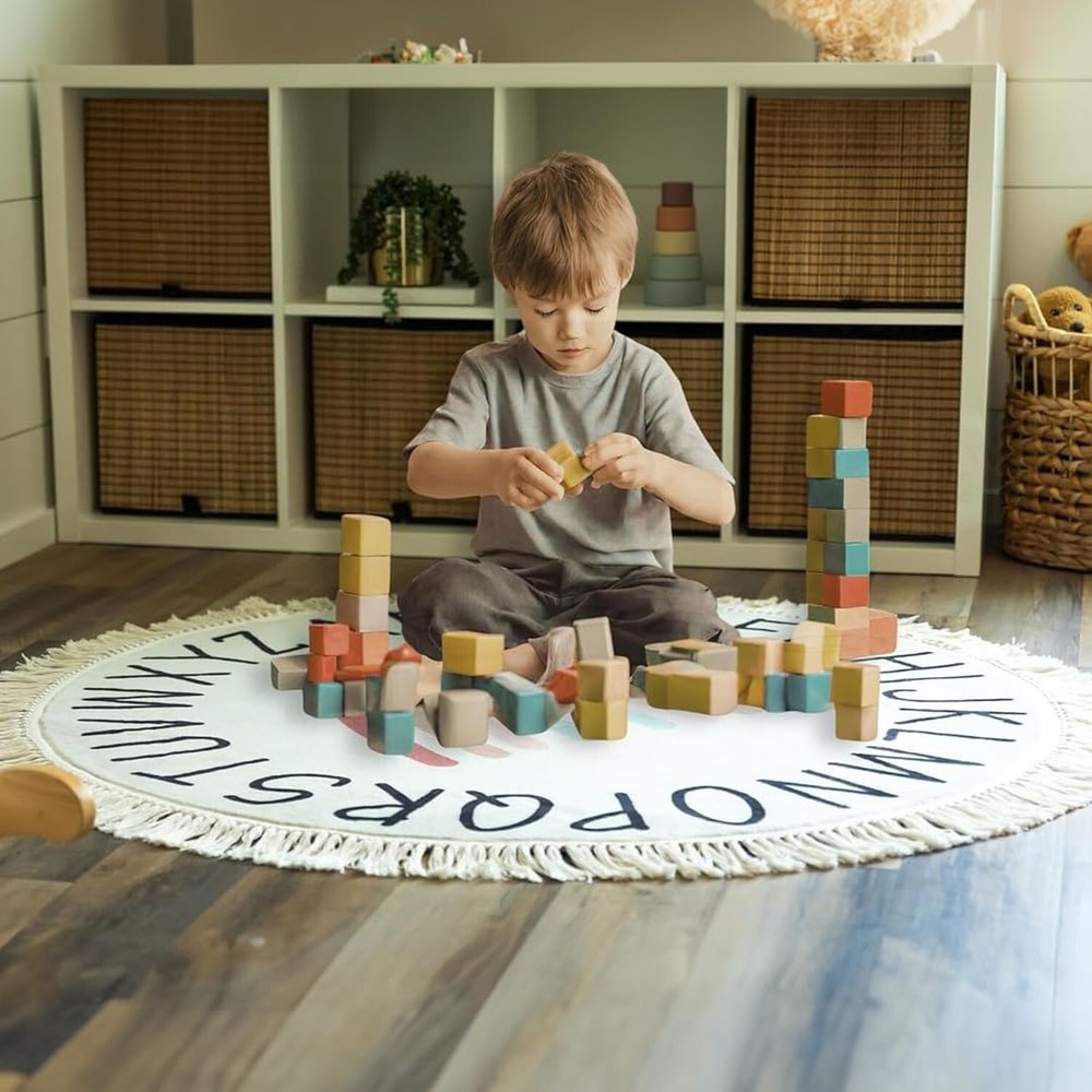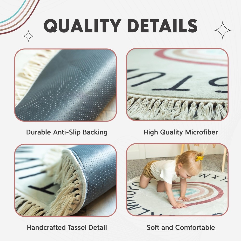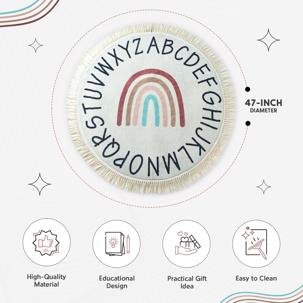 ABC Rug for Kids - 4ft Lovely Boho Rainbow Rug, Toddlers & Baby Rug for Playroom, Round Classroom Rug,Ultra Soft & Non Slip Alphabet Rug-Nursery Rug, Children's Room Carpet,Washable Kids Rug - 47 inch Product Details Brand: WHITLEYREESE&CO Size: 47 Inches Round Material: Microfiber Weave Type: Microfiber Round Rug with Handmade Tassel Pile Height: Medium Pile Brand: WHITLEYREESE&CO Size: 47 Inches Round Material: Microfiber Weave Type: Microfiber Round Rug with Handmade Tassel Pile Height: Medium Pile Construction Type: Microfiber Round Rug with Handmade Tassel Back Material Type: Gel Dot Anti Slip Color: White Indoor/Outdoor Usage: Indoor Theme: Educational Is Stain Resistant: No Product Care Instructions: Spot Clean Only, Hand Wash Only Pattern: Boho Rainbow Alphabet Shape: Round Special Feature: Handmade Tassels, Quick Dry, Foldable, Non Slip, Hand Wash Room Type: ['Classroom', 'Living Room', 'Nursery 'Play 'Bed 'Day Care', 'Dining 'Home Office'] Product Dimensions: 47"L x 47"W Rug Form Type: Area Rug Style: Boho Occasion: Children Elementary Classroom, Alphabet Educational ABC Mats for Floor Babies, Kids Playroom, Reading, Daycare, Nursery, Library Number of Pieces: 1 Item Thickness: 0.6 Inches Cartoon Character: ABC Rug Microfiber Round Rug with Handmade Tassel Water Resistance Level: Water Repellent Is Autographed: No Model Name: ABC RUG Age Range (Description): Adult Item Weight: 4.19 pounds Manufacturer: ‎WHITLEYREESE&CO Country of Origin: USA Item model number: ABC-RUG Date First Available: July 18, 2023 Large Size Boho Rainbow Rug : This ABC Rug is the perfect Toddler Rug that measures 47 inches across (4 feet!) meaning it will easily cover the majority of a bedroom or be the ideal ABC rug for classroom. Crafted with a lovely Boho Rainbow Alphabet Rug Design, adds a charming touch to any room while providing an engaging educational experience Premium Quality w/Ultra Soft Feel: Our nursery rug Made of 100% Premium Cotton and Healthy Luxury Plush, more skin-friendly and softer for all children and babies. Big enough for your baby to play games, and easy transportation when folded. Use in bedrooms, playrooms, hallways, classrooms, living room, kids room, add a sense of learning and education to any room Durable Non-Slip Backing Rug: This toddler rug is designed with a high-grade non-slip backing, which promises to stay anchored to the floor, minimizing movement and potential slips. This robust backing extends the lifespan and ensures consistent stability of the play room rug, making daily activities safer Fun & Functional Kids Rug: This durable, machine-washable nursery rug is stain-resistant and folds easily without creases. Its vibrant alphabet design makes learning fun for kids, while handmade tassels add a touch of charm. Made from premium microfiber, its soft and perfect for play Ideal Gift Idea: The letter area rug gives the perfect decorative and homely feel to any room. A great Christmas gift or holiday present for your kids,baby,grandson,granddaughter,little girl or boy. It can decorate kid's rooms, home schools and nurseries,and increase the comfort of the space. Ideal for gifts or enhancing any playroom! Perfect for Kids' Playrooms: Create a vibrant and playful atmosphere in your children's play area with our round circle rug, encouraging imaginative play and endless fun. Ideal for Nursery Decor: Transform your baby's nursery into a cozy and inviting space with our ABC Rug, adding a touch of boho charm and comfort to their first room. Round Rug for Toddlers: Designed with safety and comfort in mind, our round circle rug is the perfect spot for toddlers to crawl, play, and explore as they develop their motor skills Gentle Comfort for Babies: Crafted from premium materials, our ABC Rug provides a soft and plush surface for babies to crawl and play on, ensuring their comfort and safety. First Mother's Gift: Give the gift of comfort and style to new mothers with our ABC Rug, a thoughtful and practical addition to their baby's nursery, perfect for creating special bonding moments.
