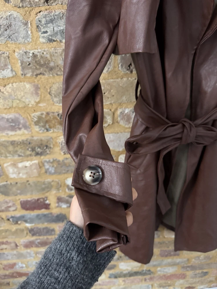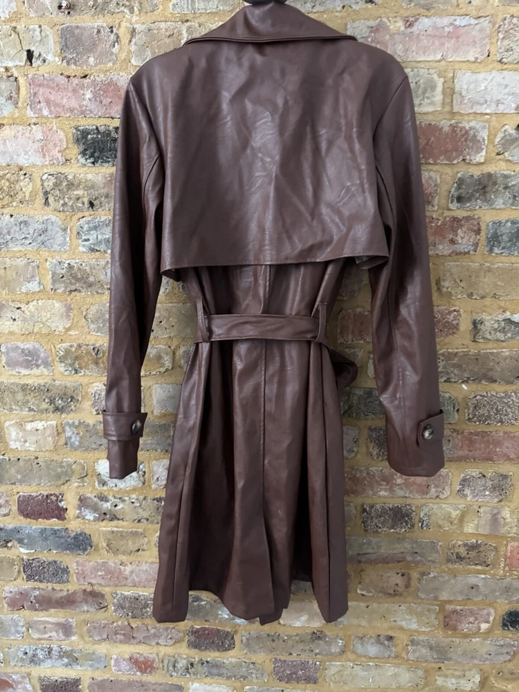 Boohoo Trench Coat Jacket Belt Button Up Small Faux Leather Size 6 Brown New no tags bought for £79 Same dsy postage if purchased by 2pm
