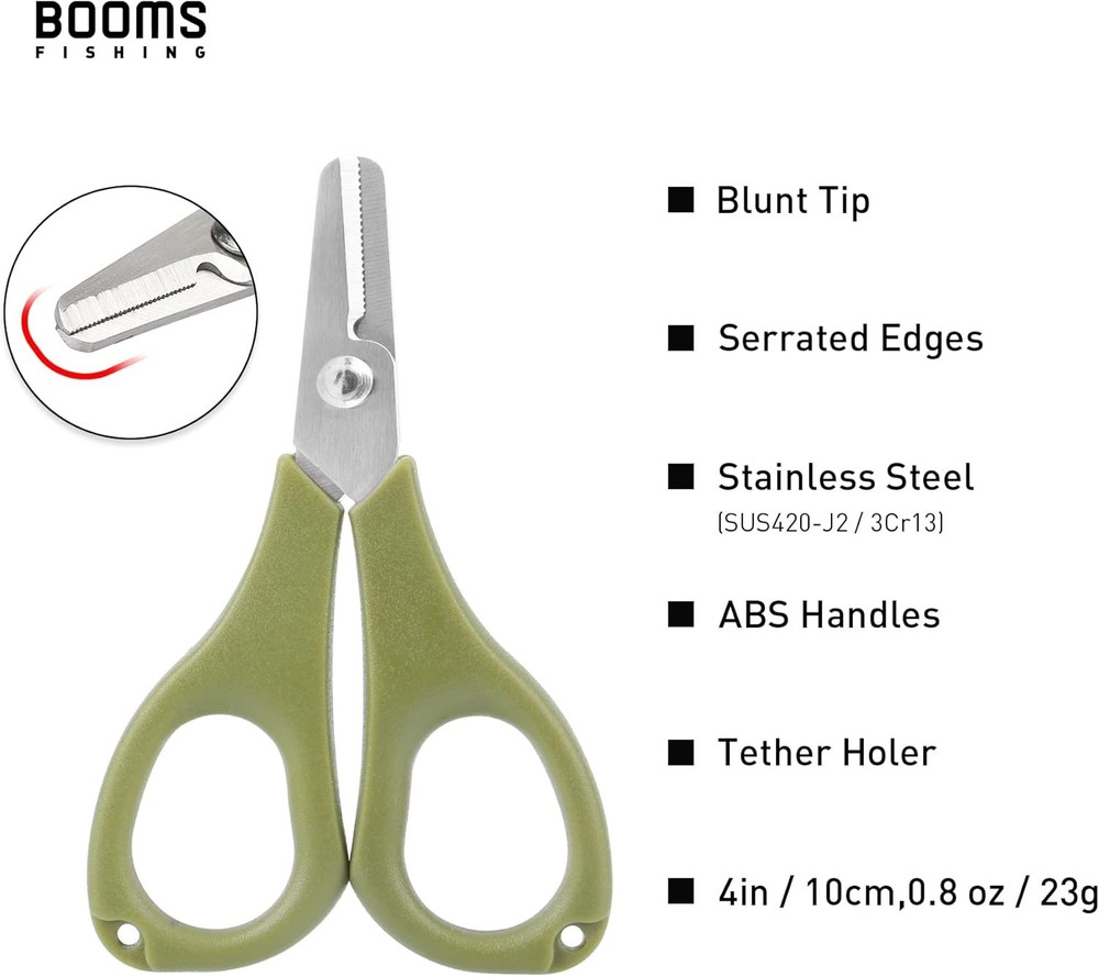 Booms Fishing S01 Scissors for Braided Line, Green With Retractor Product Details Color: Green With Retractor Material: Stainless Steel Brand: Booms Fishing Blade Material: Stainless Steel Style: Scissors with Retractor Item Weight: 0.06 Kilograms Blade Edge: Serrated Finish Type: Brushed Handle Material: Stainless Steel Hand Orientation: Ambidextrous Unit Count: 1.0 Count Number of Items: 1 Item Package Dimensions L x W x H: 7.76 x 3.35 x 0.47 inches Package Weight: 0.06 Kilograms Brand Name: Booms Fishing Manufacturer: Booms Fishing Part Number: BAFTS01RG1G1 Color: Green With Retractor Material: Stainless Steel Brand: Booms Fishing Blade Material: Stainless Steel Style: Scissors with Retractor Fishing Line Cutter: The fishing scissors is great for cutting all kinds of fishing lines. Serrated Blade and Blunt Tip: Cut braided and mono lines easily and quickly, serrated edges for easy non-slip cutting. The blade and blunt tip is also designed to avoid the cutting of your hands. Lightweight and Compact Design: The mini 3.9” scissors is small enough to easily fit in your pocket or tackle box. Durable Stainless Steel: The shears are made of stainless steel, will not rust and will not corrode, making them durable for all of your fishing needs. What You Get: A fishing scissors with a zinger retractor.