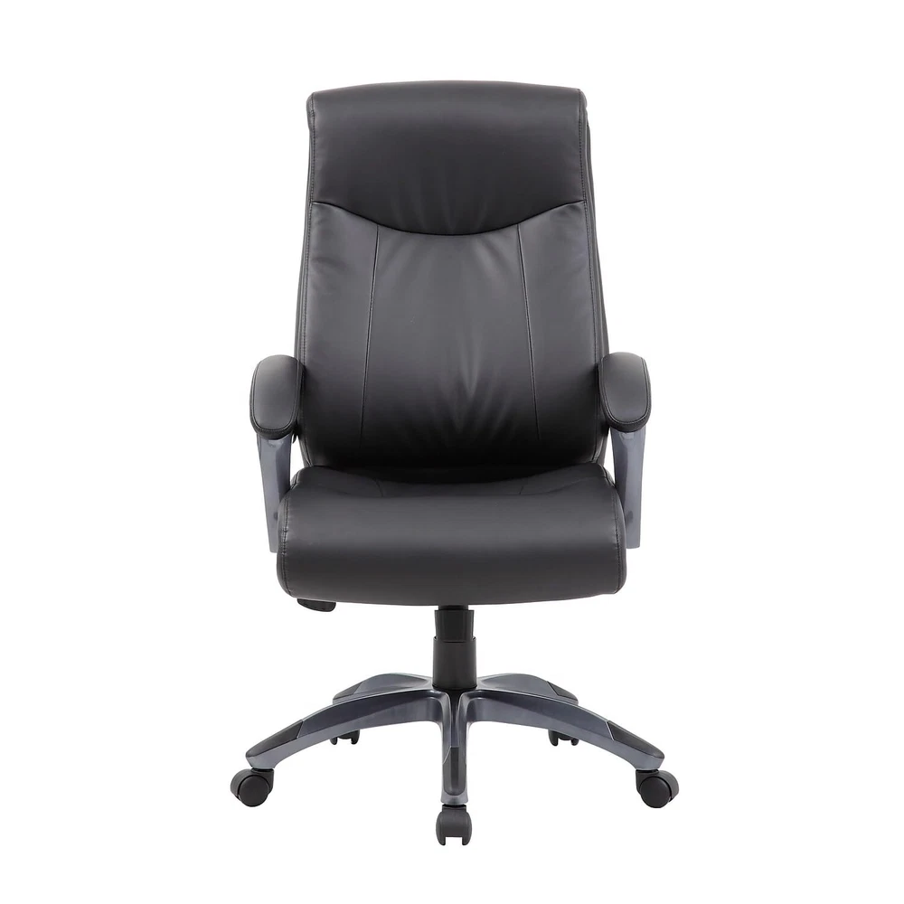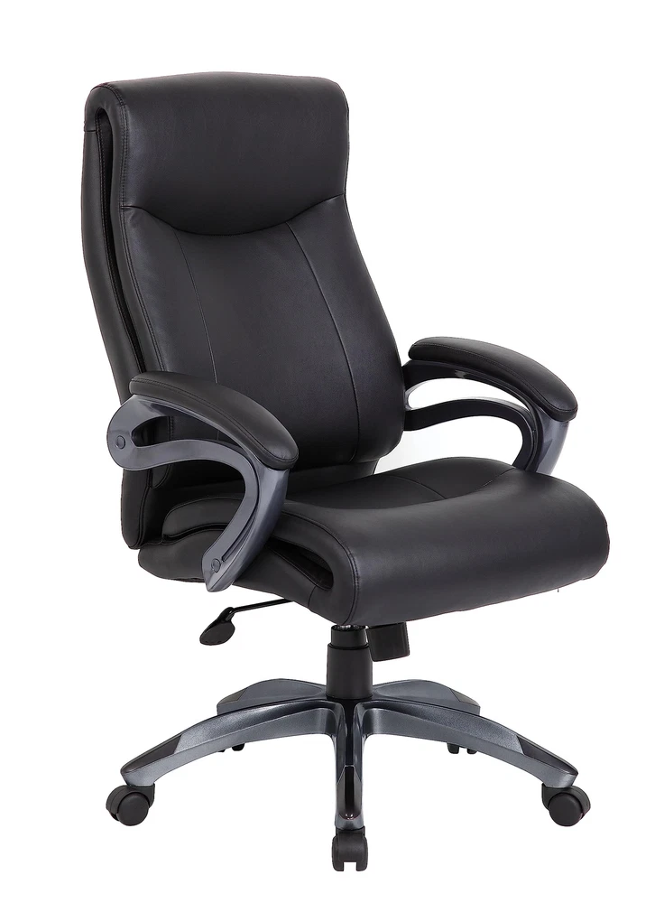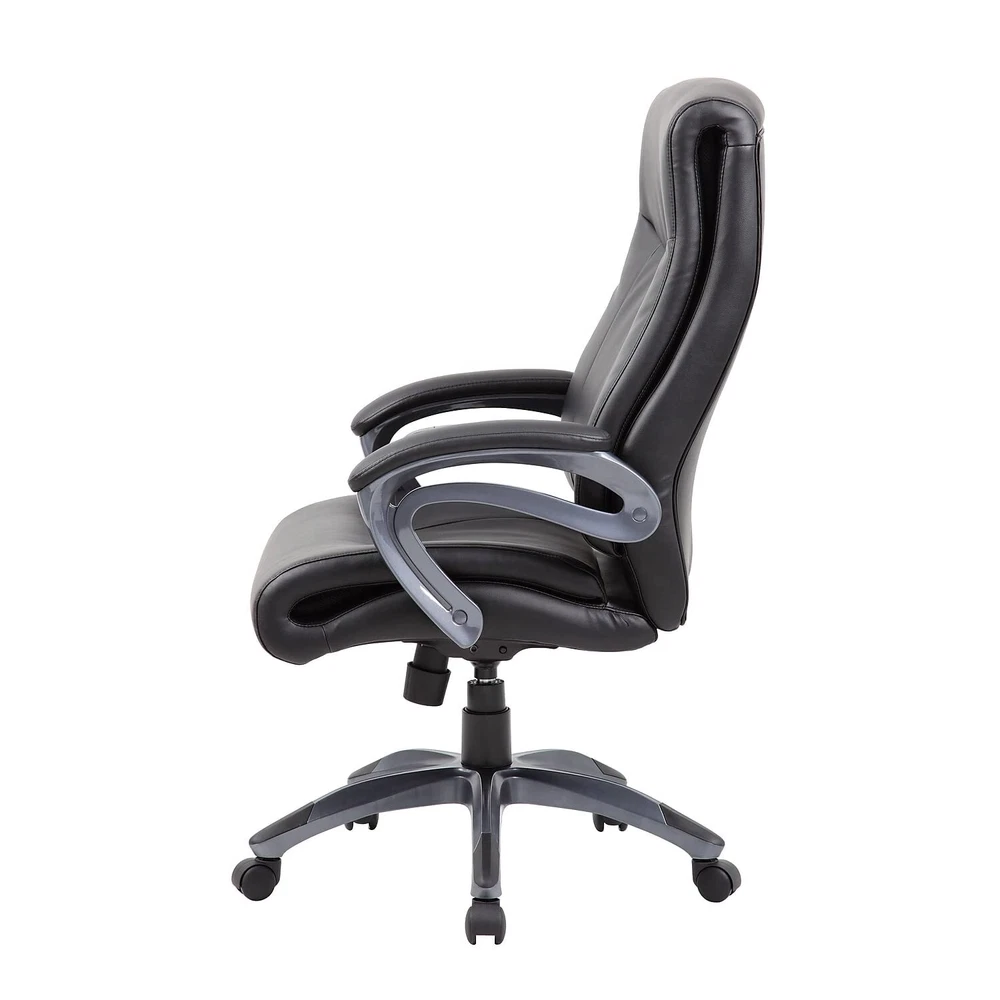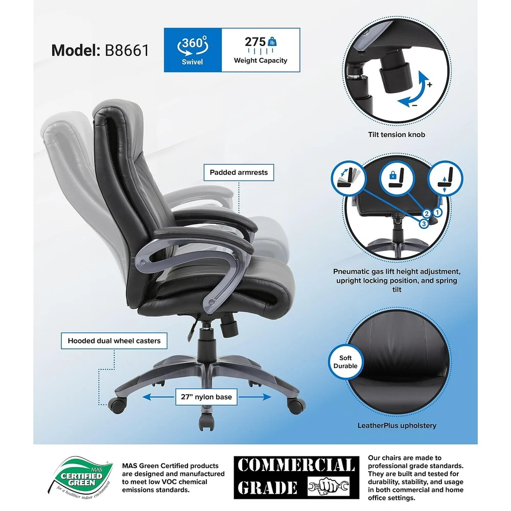 Upholstered in Black LeatherPlus. Gun metal finish on arms and base. Padded armrests. Pneumatic gas lift seat height adjustment. Adjustable tilt tension control. 27" nylon base. Hooded double wheel casters. Sold as 1 Each. Double layer executive chair. Seat dimensions: 20"W x 19"D. Assembly required. Upholstered in Black Leather Plus. Back dimensions: 20"W x 19"D. 27” nylon base with five hooded double wheel casters. Pneumatic gas lift seat height adjustment. Tilt with adjustable tension control for comfort. Manufacturer's 6-year limited warranty. Overall dimensions: 44" H x 27" W x 30" D. Weight rated up to 275 pounds.