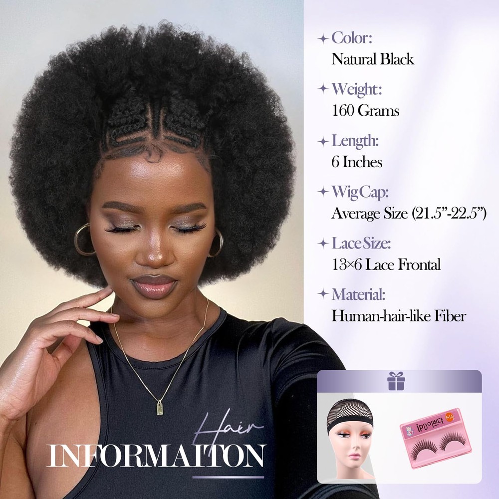 【Unique Lace Front】Achieve a stunning and effortless look with our short braided afro kinky curly wigs. this wig features a 13x6 HD transparent lace frontal, ensuring a natural and seamless hairline, soft and transparent. Suitable for any skin tone. Hand-woven braid, neat and tight. Pre plucked baby hair makes afro puff wig look more natural. 【Hair Material】The material of this afro curly wig is selected from the imported synthetic fiber, soft and light, not easy to break or shed, with natural human hair luster. People who are allergic to wig products can also the wig with confidence. 【Lace Frontal Cap】The kinky curly 13X6 lace frontal hair will be more authentic to wear, as natural as your own hair. In order to fit more women's head circumference, the wig cap adopts a uniform medium size. A hairnet is included in the package and can be used directly. It is the perfect choice for black women facing hair loss and low hair volume. 【Product Specifications】This braidded lace hair is only about 160 grams, super lightweight. There is no any discomfort to attend any occasion with it. Installation and removal are quite simple, easy to operate, saving time and effortless. 【Hair Care Tips】Handmade lace wigs may have a small amount of hair loss, please don't comb hard. When washing, don't rub vigorously, hang naturally to dry, avoid direct sunlight please.