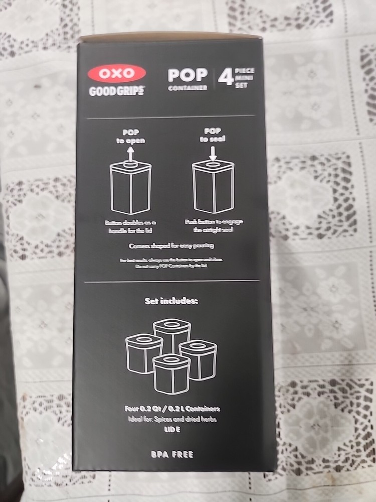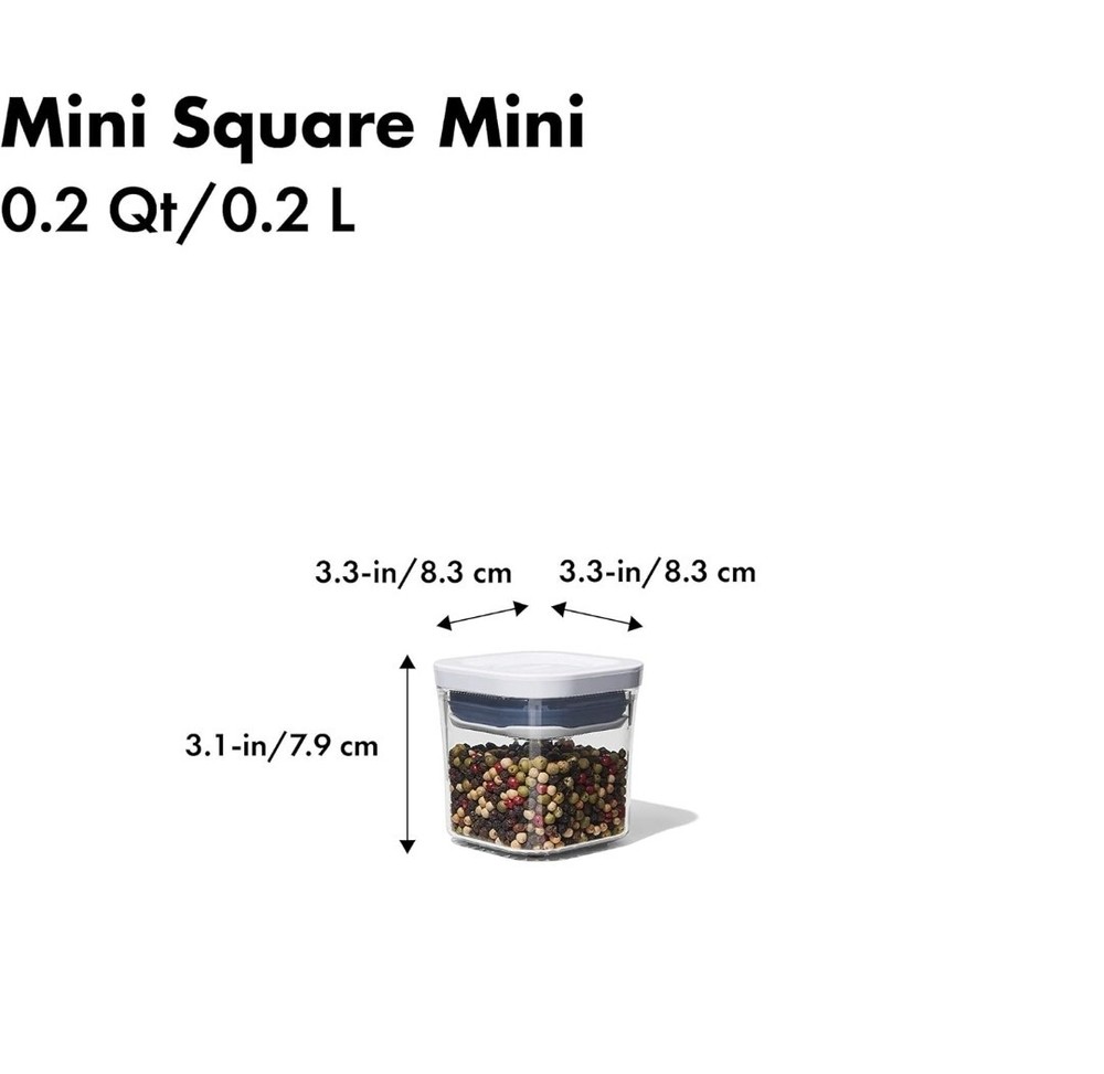 Color:ClearShape:SquareItem Height:Does Not ApplyType:Mini Pop Container SetBrand:OXONumber of Items in Set:4Item Width:Does Not ApplyFeatures:Airtight, BPA Free, Dishwasher SafeItem Length:4 inModel:OXO Good Grips
