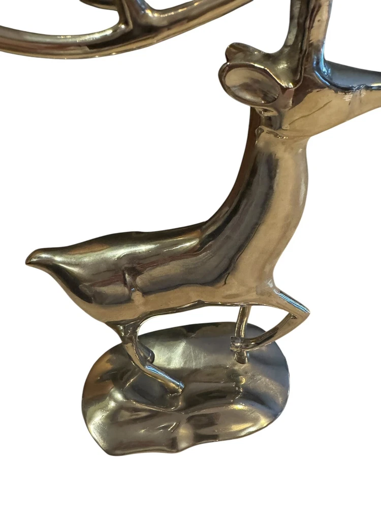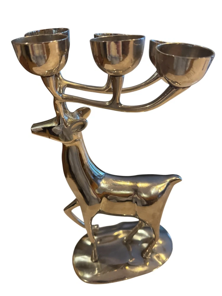 Add a touch of holiday magic to your home with this elegant Brass Reindeer Candle Holder. The nickel finish and intricate antler design make it a perfect addition to any Christmas decor. Use it to hold your favorite scented candle and let the warm glow fill the room. Crafted with care, this candle holder is not only beautiful but also functional. The six-inch diameter makes it perfect for any standard candle, and the sturdy construction ensures that it will last for years to come. Whether you're looking for a thoughtful gift or simply want to add some festive cheer to your own home, this Brass Reindeer Candle Holder is sure to impress.