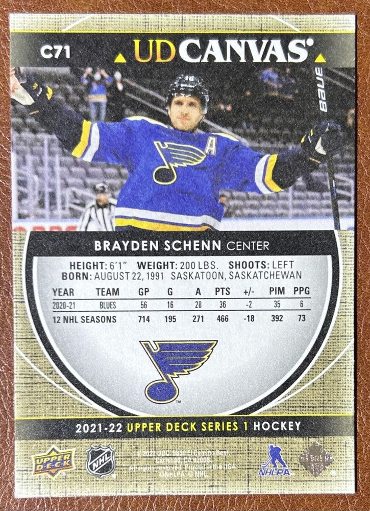 Get your hands on this authentic 2021-22 Upper Deck Series 1 UD Canvas hockey card featuring Brayden Schenn of the St. Louis Blues. This original card is made of high-quality card stock and is in mint condition. The card number is C71 and it belongs to the popular UD Canvas insert set. This card is perfect for any National Hockey League (NHL) fan or collector who wants to add a valuable piece to their collection. Don't miss out on the opportunity to own a piece of hockey history from the 2021-22 season.
