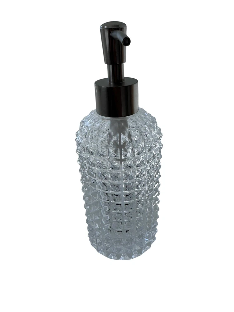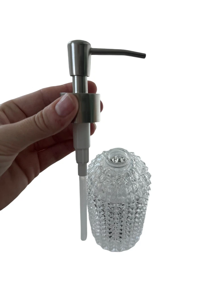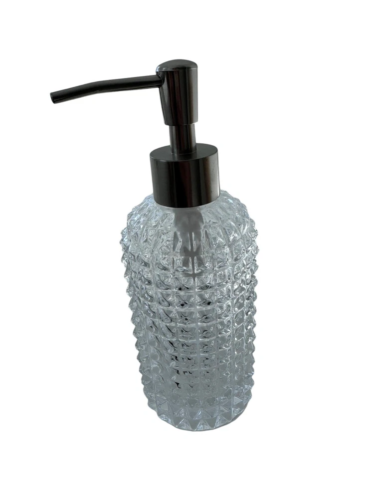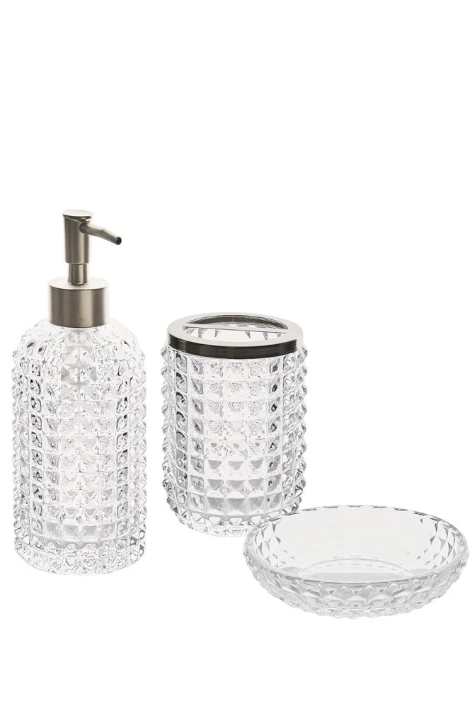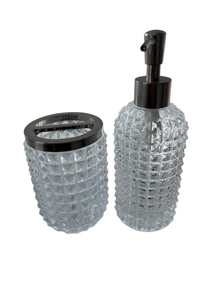 Add a touch of elegance to your bathroom with this 3-piece accessory set from House of Hampton. The set includes a clear glass toothbrush holder, lotion or soap pump, and cup, perfect for keeping your bathroom essentials organized and easily accessible. The set is made of high-quality glass and is suitable for adult use. The set is ideal for any bathroom and is perfect for holding lotions, soaps, and toothbrushes. The clear glass design adds a modern touch to any bathroom decor. The set is easy to install and use, making it a great addition to any home. Never used.