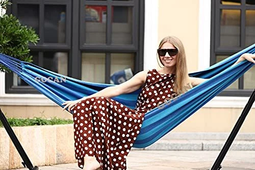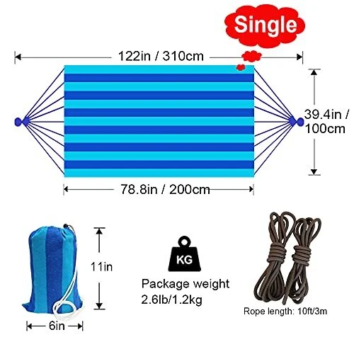 Portable Brazilian cotton canvas single hammock no stand Where do you spend your lazy days? We believe there's no better place than a hammock. That's why we created hammocks for you. A hammock so genuine and yet innovative that will turn your home, garden or camping spot into an oasis of relaxation and ease. Specifications: - Material: cotton - Color: Rainbow stripe - Hammock Bed: 78.8"(200cm) x 39.4"(100cm) - Total Length: 122"(310cm) - Weight Capacity: 400 pounds - Size: for 1 adult, 1~2 children - Hammock Stand: Recommend 9 to 14 feet - Package Size: 11 x 5 x 5 inches - Package Weight: 2.6 pounds - Store After Use: Suggested Features: - Breathable and comfortable - Durable and sturdy - Brazilian hammock - Cotton hammock What' included? - 1 x hammock - 2 x 9.8 feet strong tree ropes - 1 x drawstring carrying bag with cord lock Safety precautions (1) Always test your hanging points for stability and never set up your hammock at a height where a fall or malfunction could cause injury to you. (2) Your hammock suspension should not cause any damage to the tree. If the trees have a soft bark layer, please add a layer of padding (a towel or clothing) underneath your hammock ropes or hang elsewhere. What is your warranty policy?. If you have any issues about our products or services, please feel free to contact us first, we will get back to you within 24 hours. 【1】Cotton SINGLE HAMMOCK: This is a SINGLE hammock, the bed of this canvas hammock is 78.7 x 39.4inch(200cm*100cm), the overall length is 122in/310cm from loop to loop With our two 9.8ft tree ropes, it need to tie with the rope if you fit it with a hammock stand, since it is 1ft short for the stand. 【2】High Quality: This brazilian hammock is made of high density cotton, cotton hammock can be soft, breathable and skin-friendly. Not only comfortable, sturdy and durable, but also last long. You will be surprised the color is much brighter than others and it is so comfy when you lie in it. 【3】Holds Up To 300 Lbs: The handcrafted knots at both ends and solid fabric are strong enough to holds up to 300 lbs. It is safe for couples, children and pets to relax or take a nap, the metal ring inside each end offers extra durability for long time using. 【4】Portable And Easy To Set Up: The hammock comes with a drawstring carrying bag, it folds into a compact size when packed up, which makes it very convenient for storage or to carry. Leave it in in the backyard, set up on the patio, garden, park, porch, take it camping or use it anywhere indoor or outdoor, it's up to you. 【5】Different size to choose from: We listen to the voice of buyers, so we offer different sizes of hammocks for you to choose, single hammock, double hammock, extra large double hammock. We believe you can choose the favorite size you want.