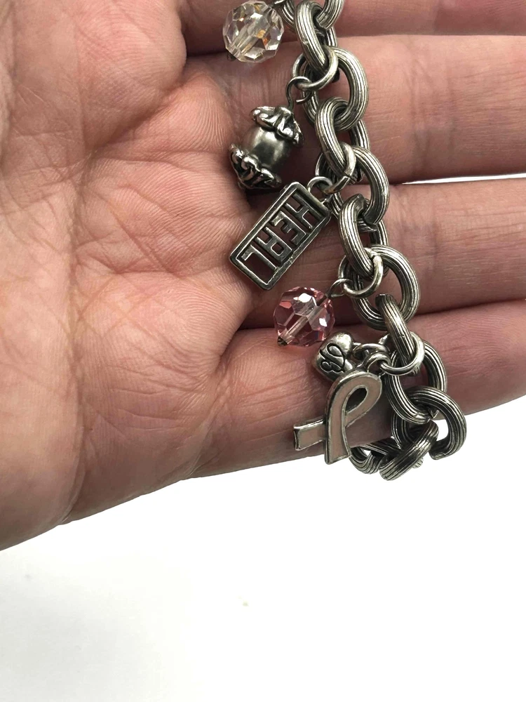 Brighton Pink Breast Cancer Engraved Words Charm Bracelet Support a cause with this Brighton charm bracelet, designed for breast cancer awareness. Features engraved inspirational words and beautiful charms, including a pink ribbon. A meaningful accessorization to any outfit. Condition: Good condition. Features: Engraved Words, Pink Ribbon Charm, Inspirational, Lobster Clasp Brand: Brighton Type: Bracelet Style: Charm Color: Pink Material: Metal