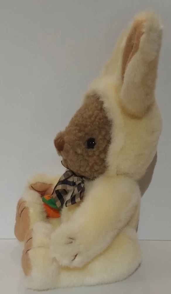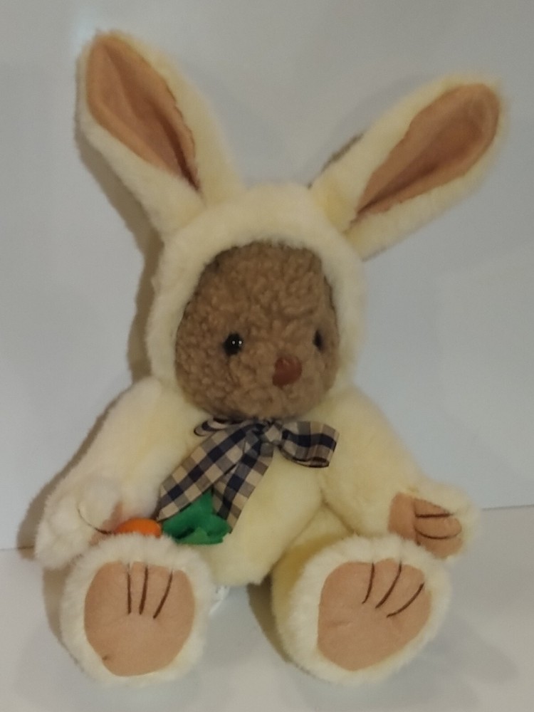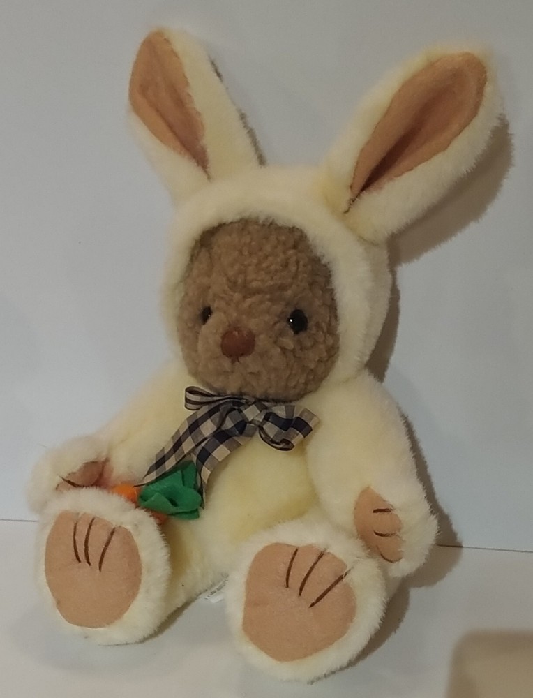 ABC Distributing Brown Teddy Bear In White Bunny Costume Plush Stuffed Animal. Condition is pre-owned. Measures approximately 12" H X 9" L X 7 1/2" W. Please refer to photos as part of the description. Shipping with USPS Ground Advantage. Thanks for checking us out.