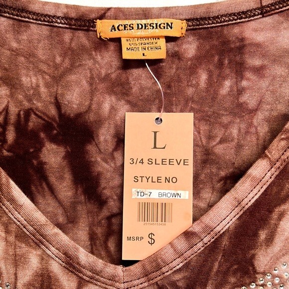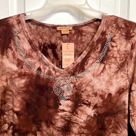 Look stylish and comfortable in this Aces Design brown tie-dye blouse. It features a V-neckline, 3/4 sleeve, and casual sleeve type, making it perfect for travel, casual wear, and work. The blouse is made of polyester and spandex and has a jersey fabric type. The top has lovely accents of beaded detailing and is unlined, lightweight, and stretchy. It is easy to maintain as it requires hand wash only and fits perfectly well with its regular fit. The blouse is a size L and has a designer, hippie, and city theme. This blouse is perfect for any woman who wants to look trendy and comfortable at the same time. 95% polyester 5% spandex super soft stretch fabric hand wash 17’ across shoulders 17.50’ long sleeves 20.50’ across chest 42’ around bottom 24’ long from collar seam to bottom front nice for casual wear