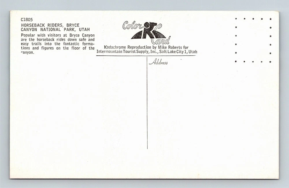 Bryce Canyon National Park, Horse & Riders Rock Formations Vintage Utah Postcard