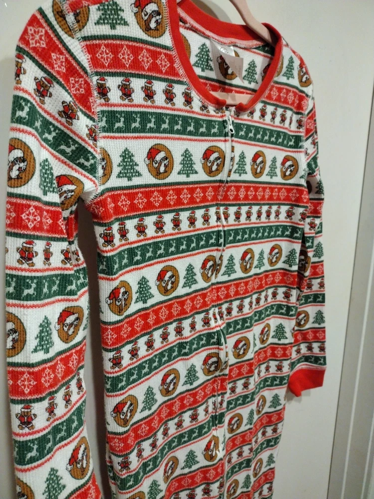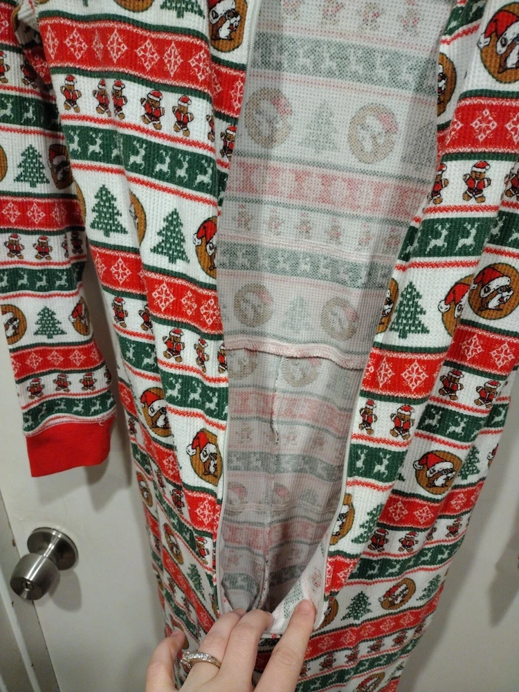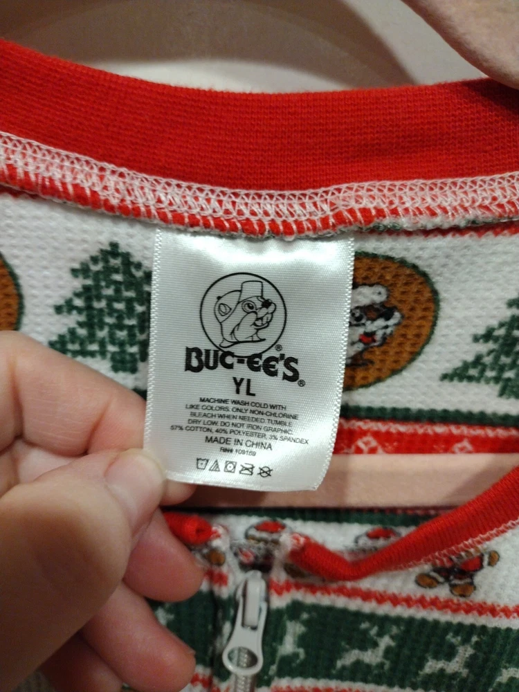 Get into the holiday spirit with this cozy Buc-ee's Merry Christmas Thermal One Piece Union Suit Pajamas. This zip-up piece is perfect for boys who want to stay comfortable and warm during the colder months. Made from a soft cotton blend with thermal fabric type, it features a multicolor Buc-ee's Christmas theme and is size youth L. The one-piece suit has a zip closure and is perfect for lounging around the house or sleeping. It's an excellent addition to any sleepwear collection and is ideal for those who want to embrace the festive season in style. This is in good condition. The back flap doesn't open. Chest 17" Sleeve 23" Length 50" Inseam 26"