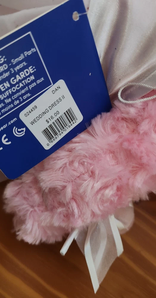 Brand new with tags Pink Cuddles BAB with sound ****plays here comes the bride, the sound chip is older i think so while the music starts out loud and normal, it starts to slow down and fade out after a few bars, still plays the whole song, its just starting to fade out**** Bear is spotless. Wedding dress new with tags Veil and corsage wristie also included