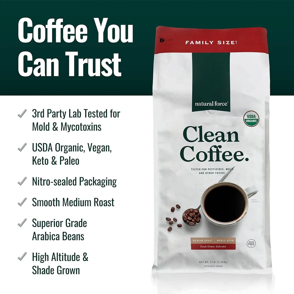 Bulk Organic Clean Coffee Classic, Mold & Mycotoxin Free, Lab Tested for Toxins & Purity, Low Acidity, Incredible Taste & Aroma, Whole Bean Medium Roast, 5 lbs ✨ 5lb Family Size Organic Medium Roast Whole Bean Clean Coffee - As much as 70% of all coffee is contaminated with mold, and other toxins. These toxins can cause brain fog, stomach irritation, and other serious health concerns. That is why we created Clean Coffee, the first coffee consciously crafted to be toxin-free from source to sip! 🔬 Tested for Mold, Mycotoxins, Gluten, & More - 5lb Family Size Clean Coffee is 3rd partly lab tested and independently analyzed for the presence of mold, mycotoxins (ochratoxin A, aflatoxin), acrylamide, heavy metals, gluten and more. And, unlike other companies, we freely share the results of our testing because we have nothing to hide! ☕ Low Acid & High Antioxidant - Clean Coffee Family Size is a smooth, low acid coffee that is also gentle on sensitive stomachs. Cup for cup, Clean Coffee also contains more antioxidants than blueberries and dark chocolate! We even compared Clean Coffee to 44 competitor products like Bulletproof, Starbucks, and Trader Joe’s and found that our coffee has the highest antioxidant content of all tested products. ✔️ Certified USDA Organic, Keto, Paleo, & Vegan - Clean Coffee is 3rd party certified by top organizations like The Paleo Foundation, and Vegan Action. 🙌 100% Health & Happiness SATISFACTION GUARANTEEd - We value our customers and want you to be healthy and happy. If you have any questions, comments, or concerns, simply send us a message from your account and our world-class Customer Support team will make it right.