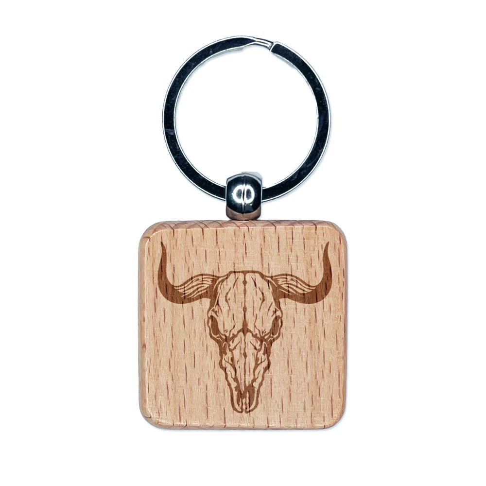 Bull Skull Engraved Wood Square Keychain Tag Charm