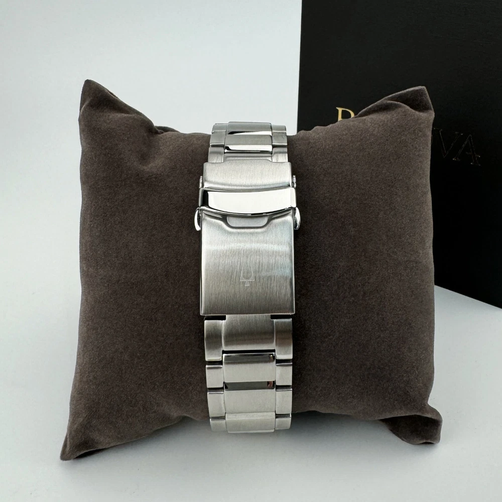 From the Marine Star Collection. New six-hand chronograph movement with 200-meter water resistance. In stainless steel with black glass insert on ratcheted rotating bezel, black dial with luminous hands and markers, and calendar feature, domed mineral crystal, screw-back case, stainless steel bracelet with fold-over buckle closure, safety bar and extender. Quartz Watch, movement powered by a battery. The quartz crystal regulates the time and is water-resistant up to 0200M. Brand new with box We use USPS or UPS with tracking number MODEL 96B272 MOVEMENT 6S20 TECHNOLOGY Quartz A movement powered by a battery. The quartz crystal regulates the time achieving accuracy to 15 seconds a month. CASE WIDTH (MM) 45 LUG WIDTH (MM) 22 DIAL Black Silver-Tone Luminous Hands and Markers STRAP TYPE Bracelet Stainless Steel CASE MATERIAL Silver-Tone Stainless Steel CLASP Safety Fold Over Clasp with Push Buttons CRYSTAL Domed Mineral Crystal Impact and shatter resistant, dome-shaped crystal raised at an angle within the bezel WATER-RESISTANCE 0200M ADDITIONAL FUNCTIONS 6 Hand 1/20 Second Chronograph Measures up to 60 Minutes Calendar Small Second Hand Thanks for shopping at our store! If you are happy with your purchase- we would appreciate a 5-star rating and positive feedback! We answer messages daily, but please allow at least 12 hours for a reply- sometimes it takes us awhile to catch up on after hour messages If you have a shipping related question/request, please put it in the message box at checkout- Once the order is completed, the confirmed address on file cannot be changed.