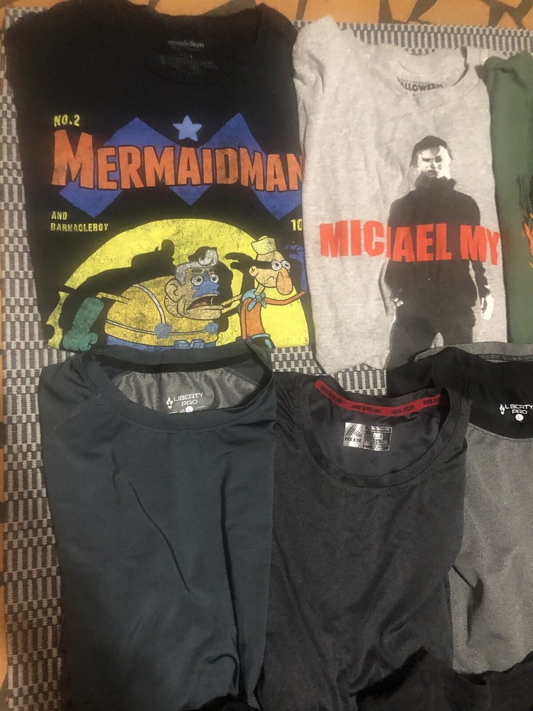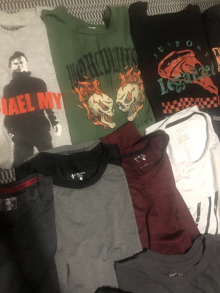 Great condition, pet free smoke free. Last row is XL. Elevate your wardrobe with a diverse bundle of men's graphic tees and Dri-Fit shirts, available in sizes Large and XL. Each shirt is designed to offer a comfortable classic fit, with a crew neckline and short sleeves, perfect for any casual occasion. The assortment includes shirts that showcase a variety of themes, from retro and preppy to hippie and grunge, ensuring you'll find a shirt that matches your style and mood. Crafted from a blend of cotton, polyester, and cotton blend materials, these shirts are machine washable for easy care. The multicolor graphic patterns add a touch of personality to each piece, making them ideal for those who appreciate art and unique design. Whether you're hitting the outdoors or just lounging around, these shirts are made for all seasons and are sure to become go-to staples in your collection.