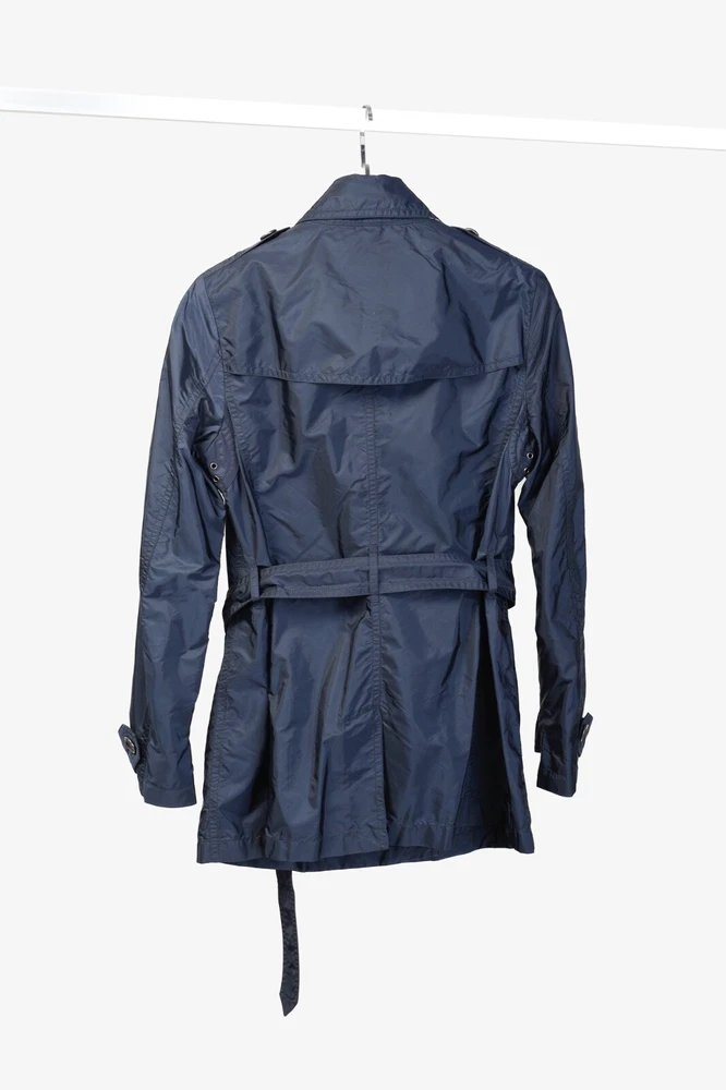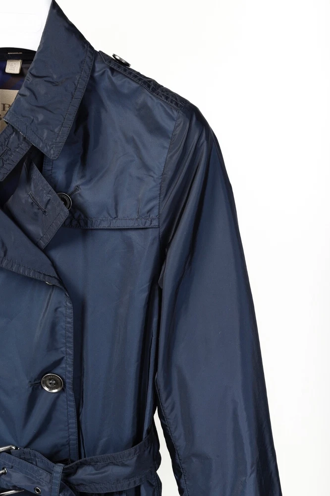 This rain coat from Burberry Brit is crafted in navy blue nylon, and features long sleeves, button-closure tabs on the cuffs, shoulder epaulettes, a collared neckline with an oversized hook closure and button-closure throat latch, double-breasted button closures, grommets for venting on the underarms, a self-belt, front button-closure pockets, a back vent, and is partially lined in a blue check synthetic on the bodice, and a tonal satin on the sleeves. Size: US 8 (M) Condition: Great; light marking on right chest, near left armhole, and front right hem Approximate Measurements (laid flat): Shoulder: 15" (38 cm) Chest: 19.5" (49.5 cm) Waist: 18.25" (46 cm) Length from back: 28.5" (72 cm) Sleeve length: 25" (63.5 cm) Composition: Outer/main fabric: 100% polyamide (nylon). Upper body lining: 100% polyester. Sleeve lining: 100% cupro. Undercollar: 100% cotton.