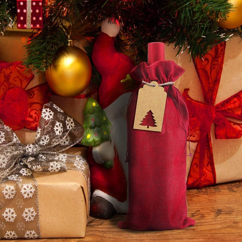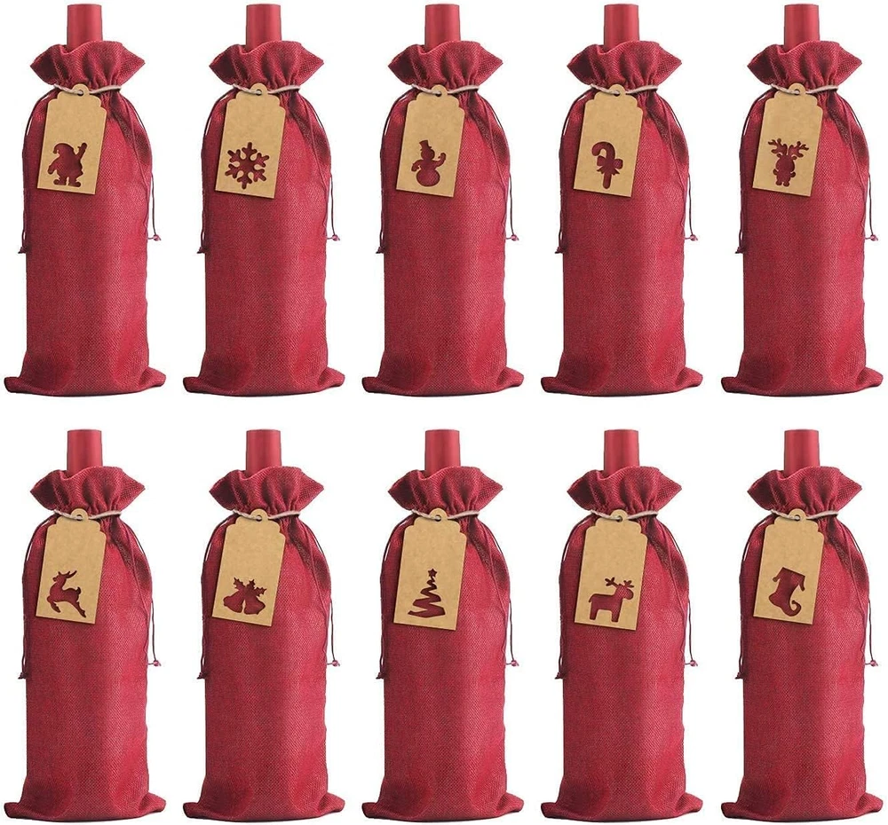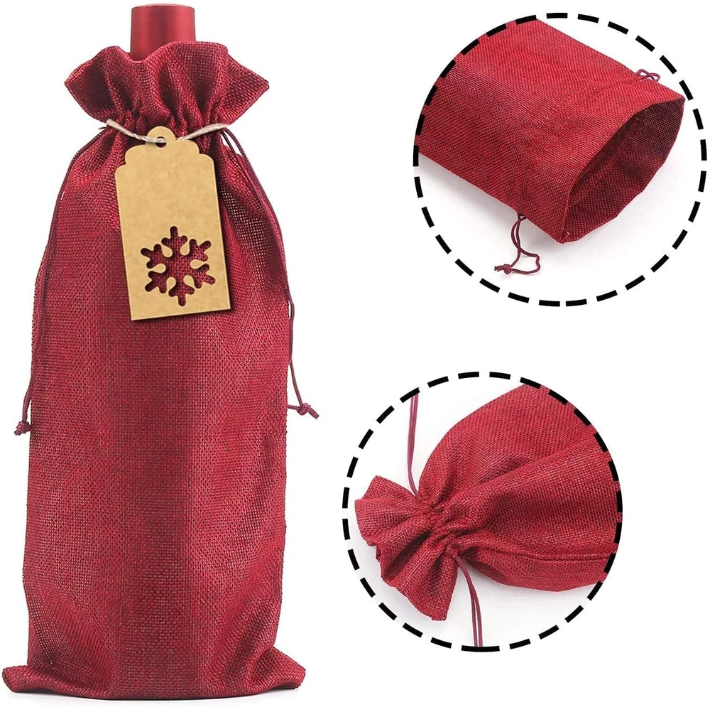 Material:Made of premium quality burlap.The natural burlap fabric materials make the burlap wine gift bags more breathable durable,reusable and eco-friendly,red wine bottle covers bring everyone to the happy warm festival atmosphere Dimension:Each burlap wine bag measures approx 36 cm x 16 cm / 14.2" x 6.3",accommodate a regular 750ml wine bottle.Each gift tag is approx 9.5 cm x 4.5 cm / 3.75” x1.77”,1 roll jute string is approx 16.4 feet enough for use Package Includes:Totally 12 PCS wine bottle bags,24 PCS gift Tags with 12 designs and 16.54 feet jute string,This tags has a blank design,you can write whatever you like on it.Tags are pre-punched with holes and convenient to use Drawstring&Festival Design:Jute wine bottle bags comes with a drawstring which makes the bag easy to close and open,convenient for storage wine bottle or other things.The Kraft paper tag design with Christmas tree,Bell,Snowflake,Stocking,Reindeer,ect Multiple use:These burlap wine bags suitable for package wine bottles and Champagne bottles,not only protect them from dust,and make it looks great.Perfect for wine bottle storage,Christmas,weddings,birthday,festivals and travel Product Description About STEFORD Christmas Burlap Wine Bags This is WHY You Choose Us ! ! ! - Material: Premium Quality Burlap,The natural burlap fabric materials make the burlap wine gift bags more breathable durable,reusable,red wine Wine Bottle Covers bring everyone to the happy warm festival atmosphere - Dimension: Each burlap wine bag is approx. 36 cm x 16 cm / 14.2" x 6.3",accommodate a regular 750ml wine bottle.Each gift tag is approx. 9.5cm x 4.5cm / 3.75” x1.77”,1 roll jute string is approx16.4 feet enough for use - Package includes: 12 Pcs wine bottle bags,24 PCS gift Tags with 12 design and 16.54 feet jute string,This tags has a blank design,you can write whatever you like on it.Tags are pre-punched with holes and convenient to use - Drawstring &Festival Design: Jute wine bottle bags comes with a drawstring which makes the bag easy to close and open,convenient for storage wine bottle or other things.The Kraft paper tag design with Christmas tree,Bell,Snowflake,Stocking,Reindeer,ect - Multiple use: This burlap wine bags suitable for package wine bottles and Champagne bottles,not only protect them from dust,and make it looks great. Perfect for wine bottle storage,Christmas,weddings,birthday,festivals and travel Perfect Christmas and Holiday Gifts & Decorations 12 Different tags with Hollow cut design ,press the hollow cut and the design will perfect showing,easy to use Comes with a drawstring which makes the bag easy to close and open,12 different tag makes it more festval Suit for Christmas,New Year,holiday celebration,parties,wedding,home,etc