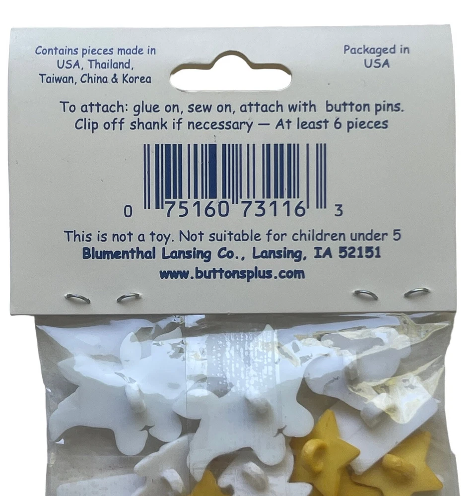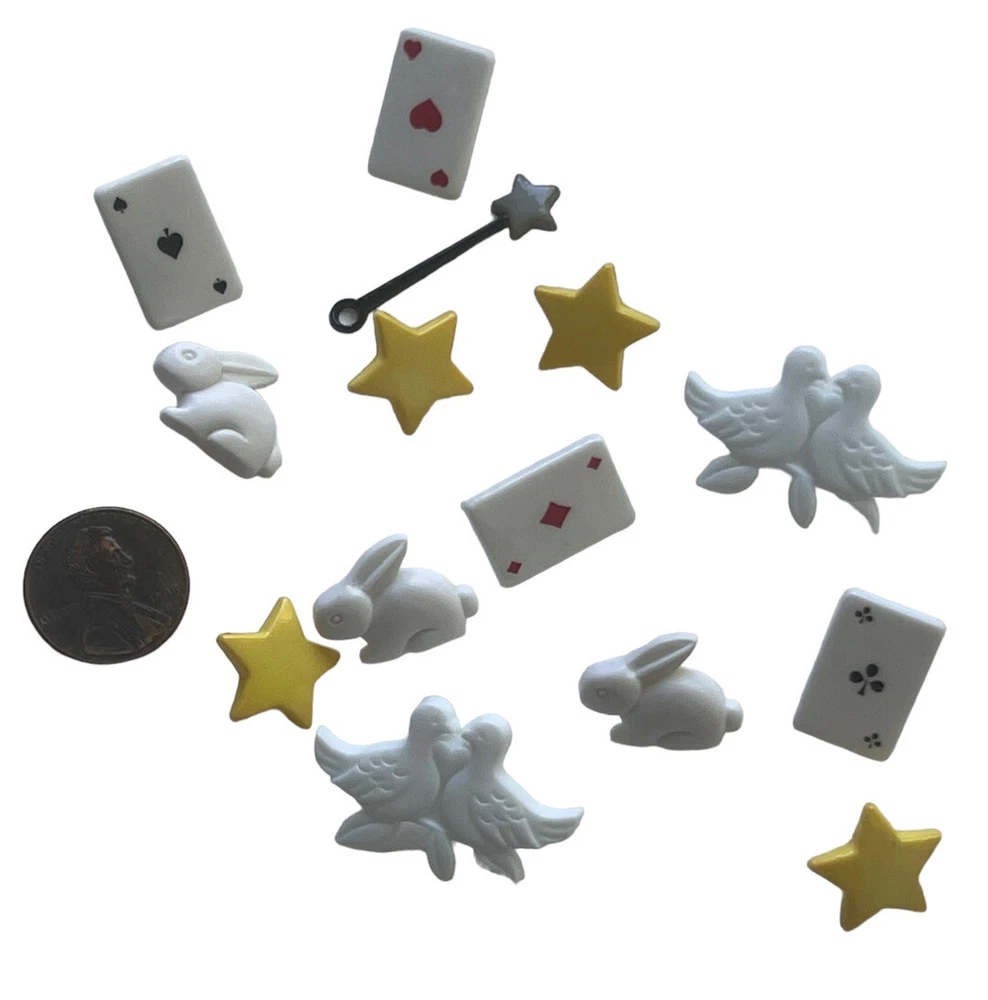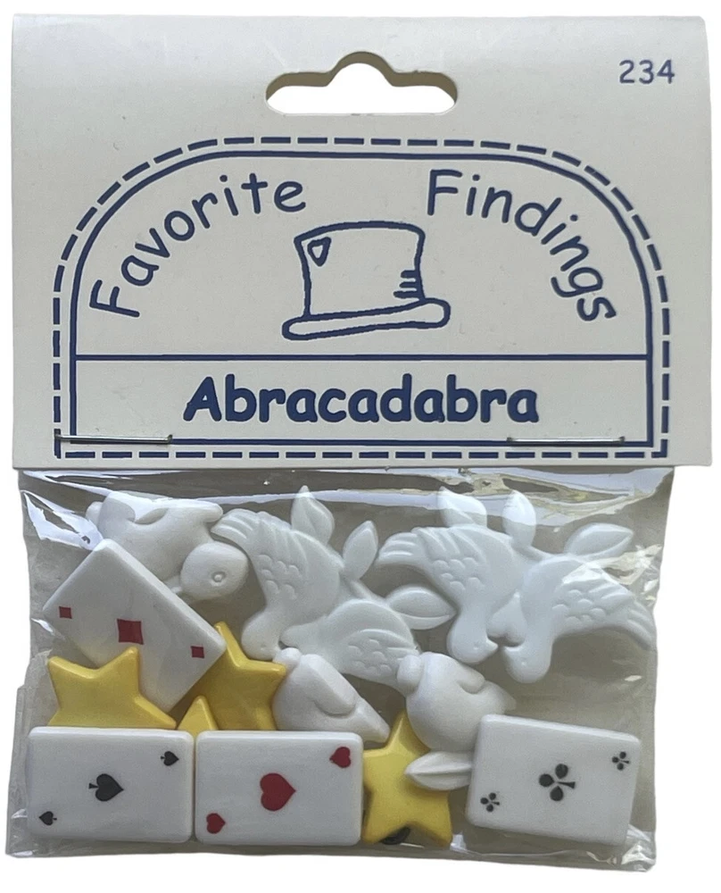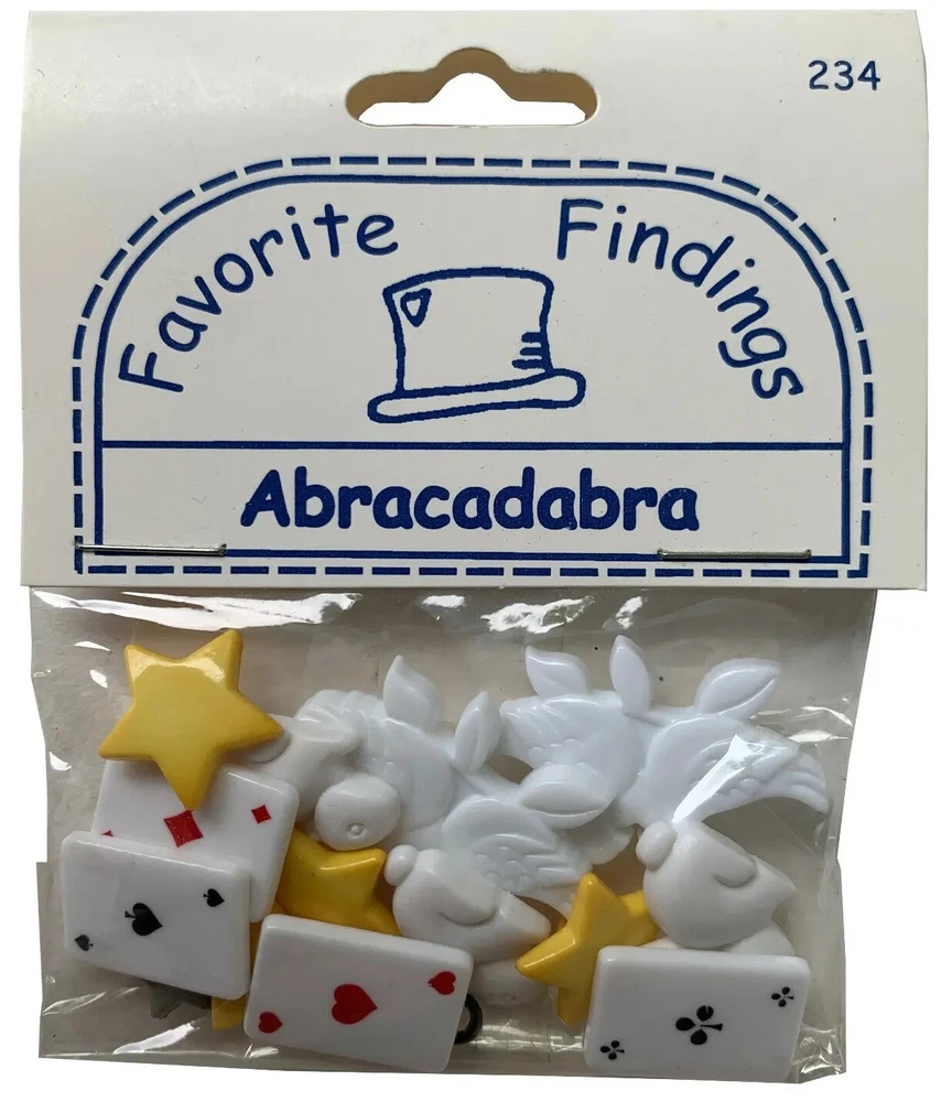 New Favorite Findings Blumenthal Lansing "Abracadabra" magician's magic props themed craft buttons including cards, doves, bunnies, magic wand, and stars. Packaged in the USA of pieces from the USA, Thailiand, Taiwan, China & Korea. Glue on, sew on, or attach.
