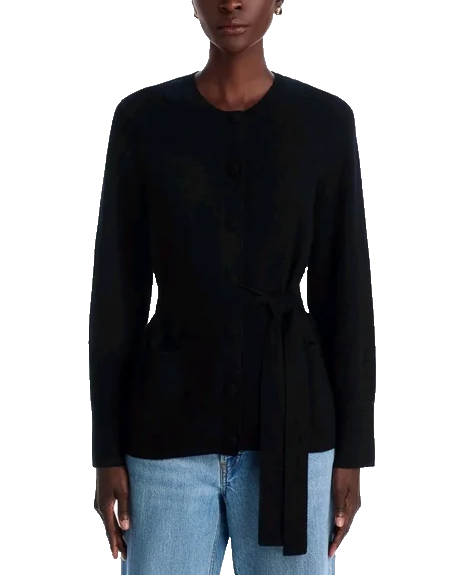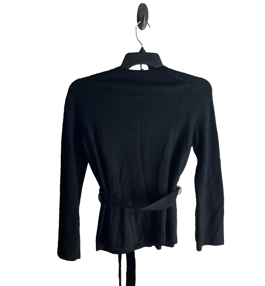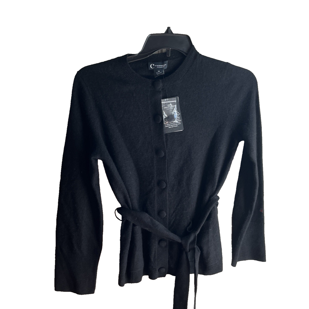 C by Bloomingdale's 100% Cashmere Crewneck Cardigan Sweater size: XS color: Black Crewneck Long sleeves Front button close Ribbed trim Removable belt Front pocket retail $198 underarm to underarm 19" collar to bottom 26" R743