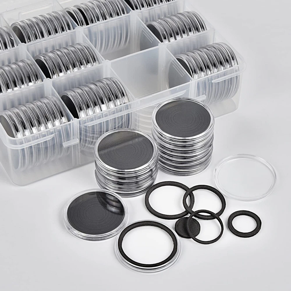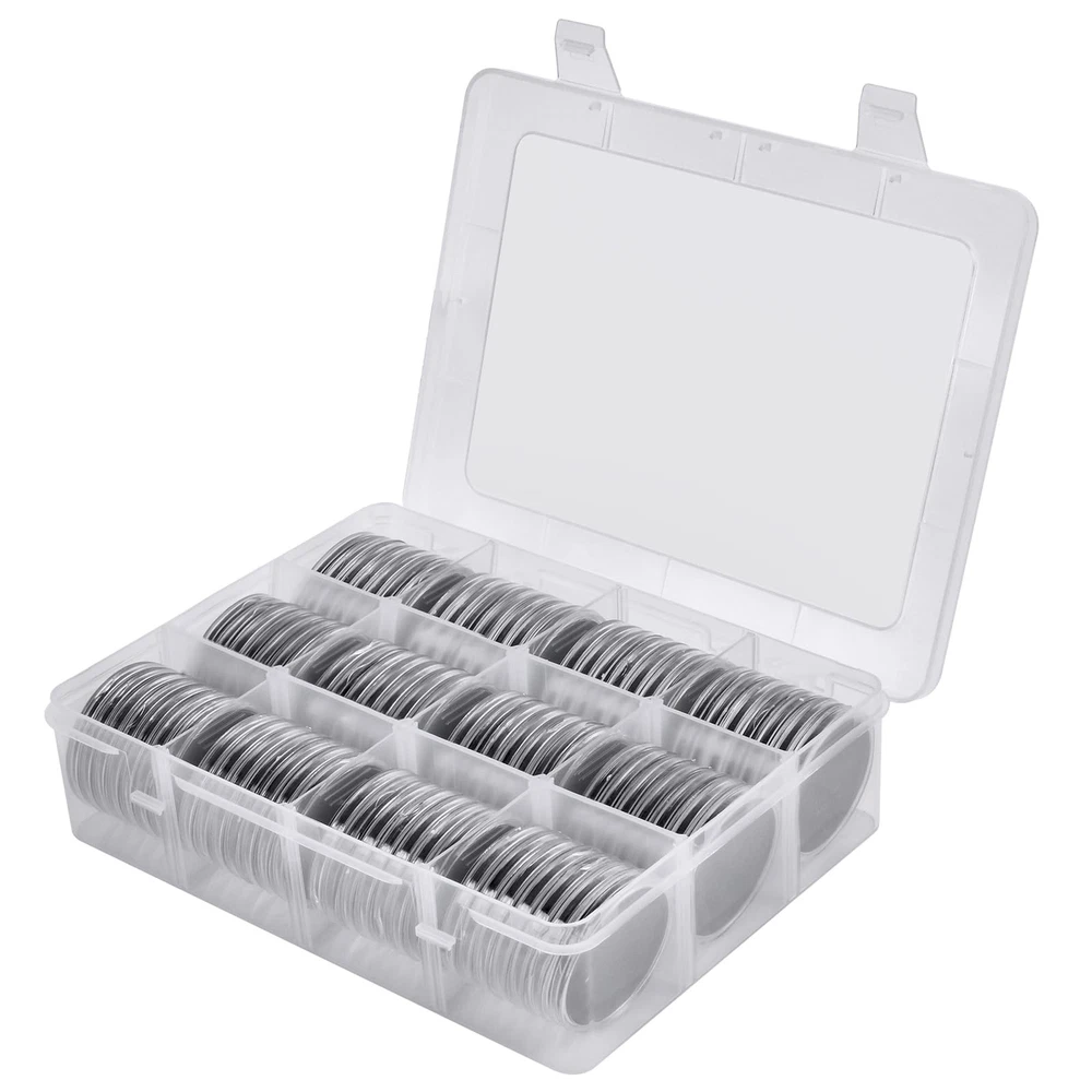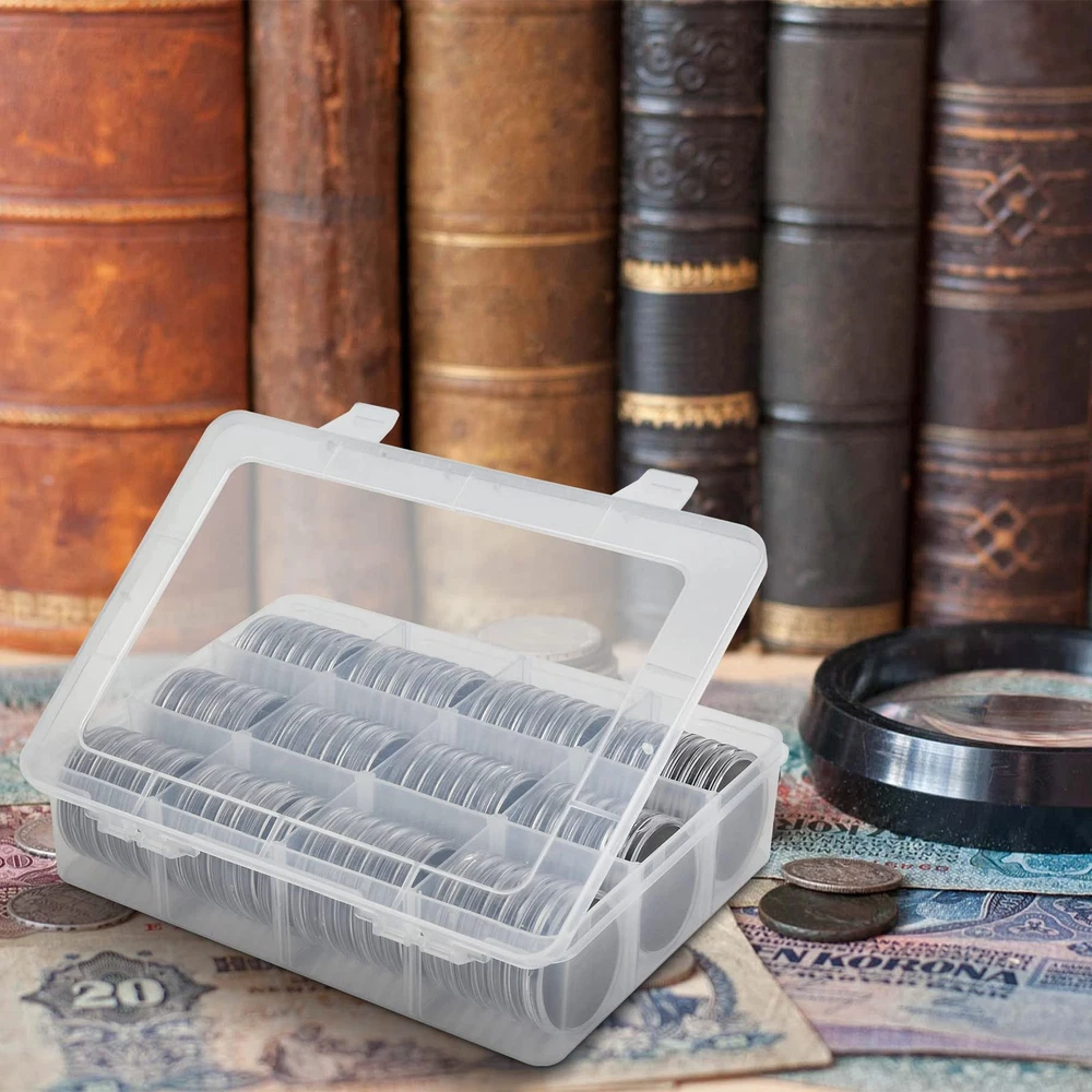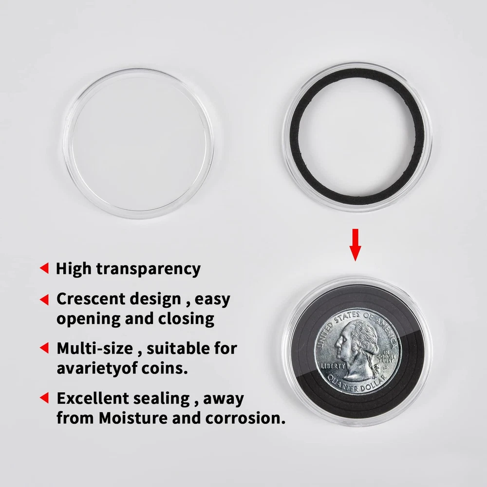 Package include: 84 pieces 46mm coin capsules, 84 pieces EVA foam gasket, one plastic challenge coin display case storage box. The protective Plastic storage with 12 grids, 9 removable dividers, every grid can contain 7 coin capsules. Size: 8.85 x 6.69 x 2.16 in. Universal silver dollar coin holders suitable for: The coin capsule inside size is 46*3mm, sutiable for holding almost all kinds of coins the diameter does not exceed 46mm, like 2020 - American Silver Eagle coins, bullion coins, challenge coins, or dollars, etc. 6 sizes foam gaskets (20/25/27/30/38/46mm), You can DIY the gaskets to fit your coin, prevent it from moving around. Double protection display Coin Trays & Coin Boxes: ntag215 Coin capsules are made of thickened plastic, transparent. The plastic coin holder organizer provide another protection to coin capsules, made of H&Q material, hold 84 capsules, keep them snug in place all the time, it can prevent capsules and coin from damage and falling off. Keep your coin clean and safe all the time. Convenient design coin collection supplies storage box: Crescent opening design make it convenient to open and close, the eva foam gasket easy to remove it to fit your coins. This coin holder protector come with 9 removable divider, you can easily to collect you coin in classification, each grid for different type coins. With 2 secure clip lock easy for closing and opening, keep your coin safety in place. Great as a present: Clear coin containers holder conduce to coin storage, view and exchange, great display coin holder, portable and easy carrying, good present for coin collectors to protect and store their favorite coins, with any quality problem, we will always on your service.
