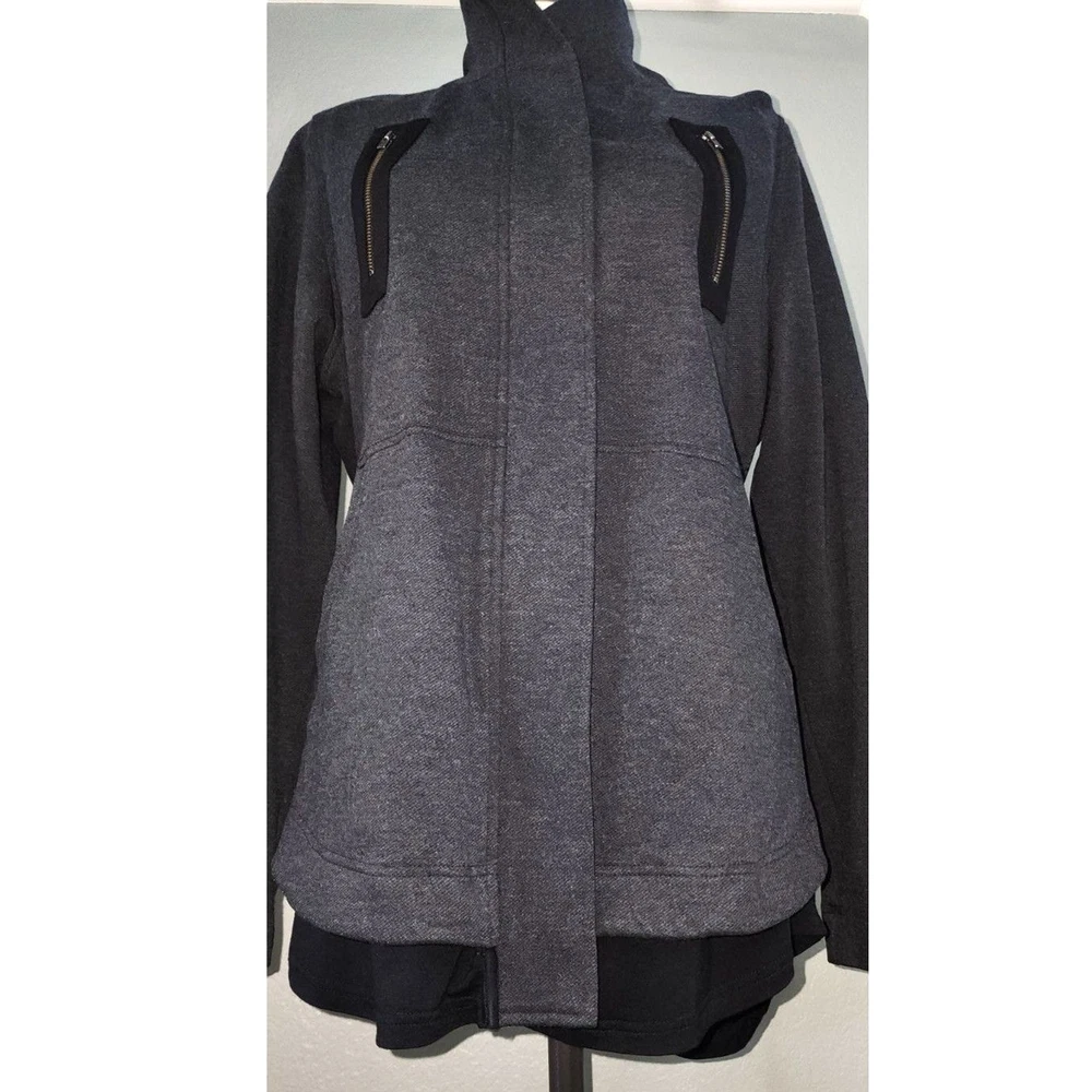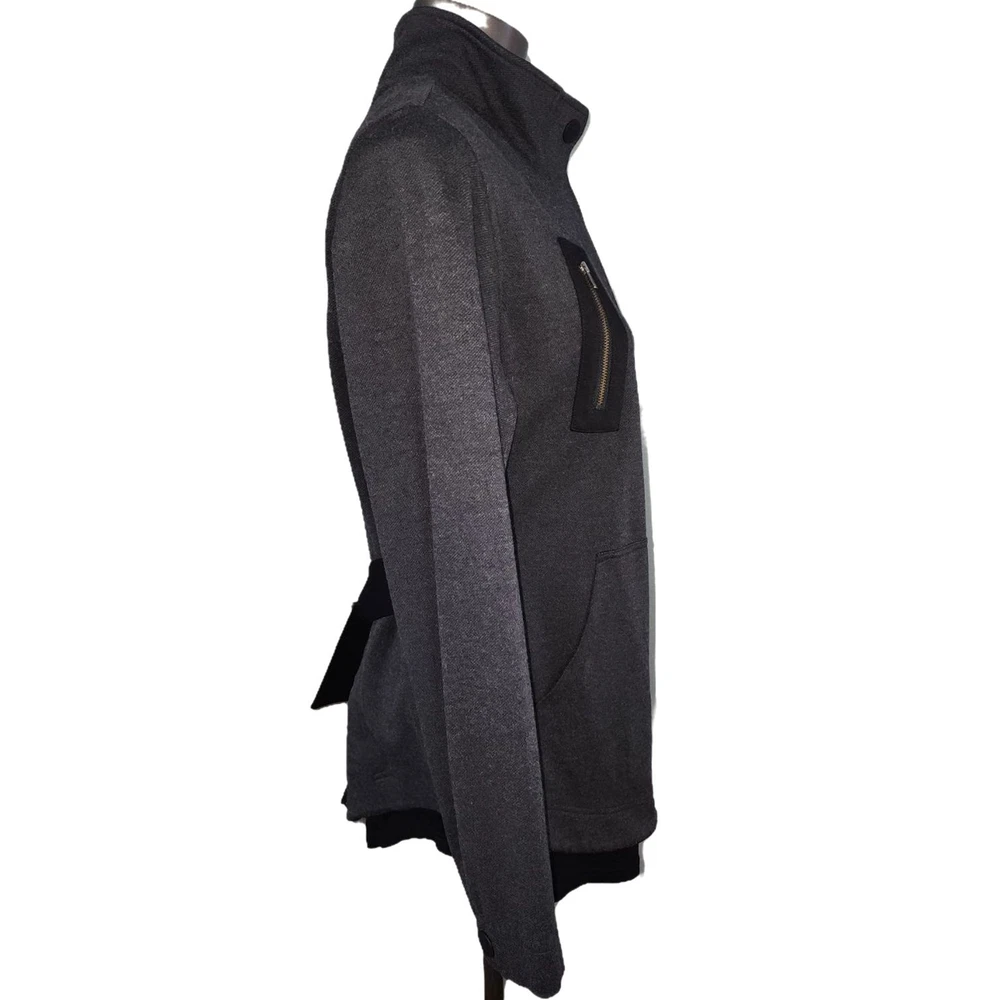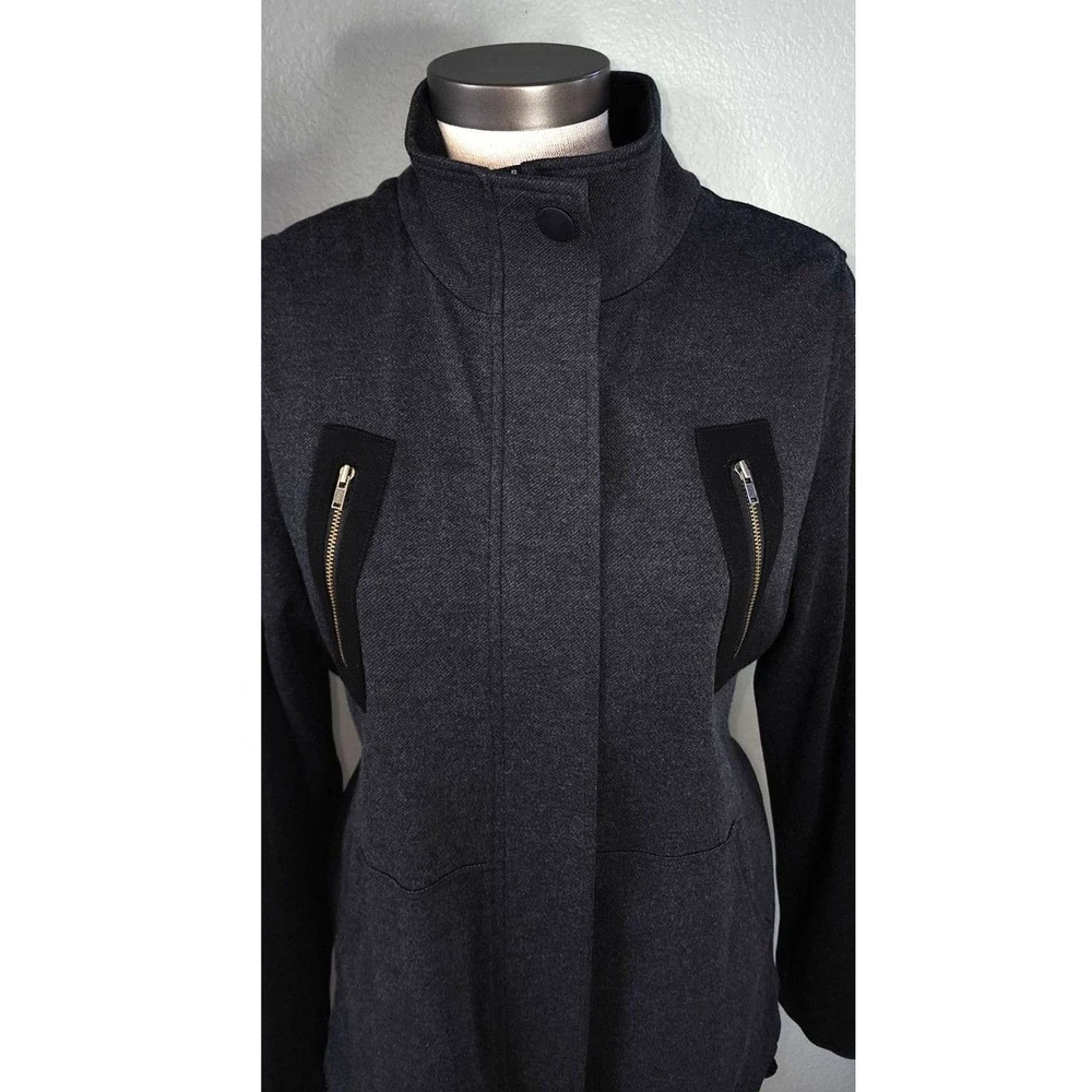 CABI 'Love Carol' Charcoal Grey Fleece Black Mesh Back Utility jacket Size M. This cute and chic jacket is made of super soft rayon, nylon and spandex blend with zipper closure and cute mesh back with adjustable cinch waist in front or back. Excellent condition.