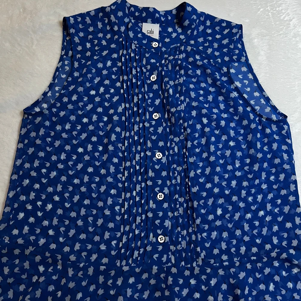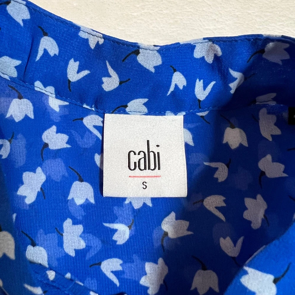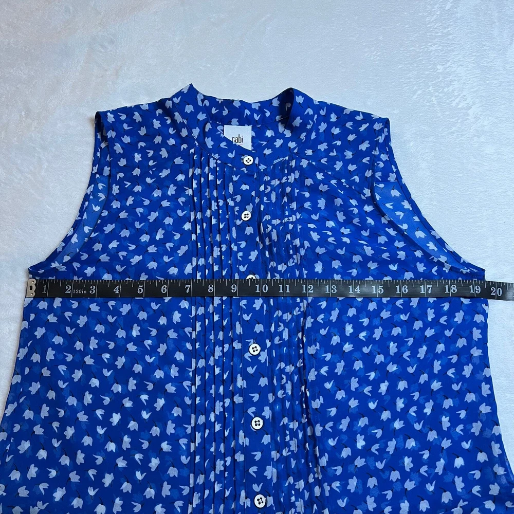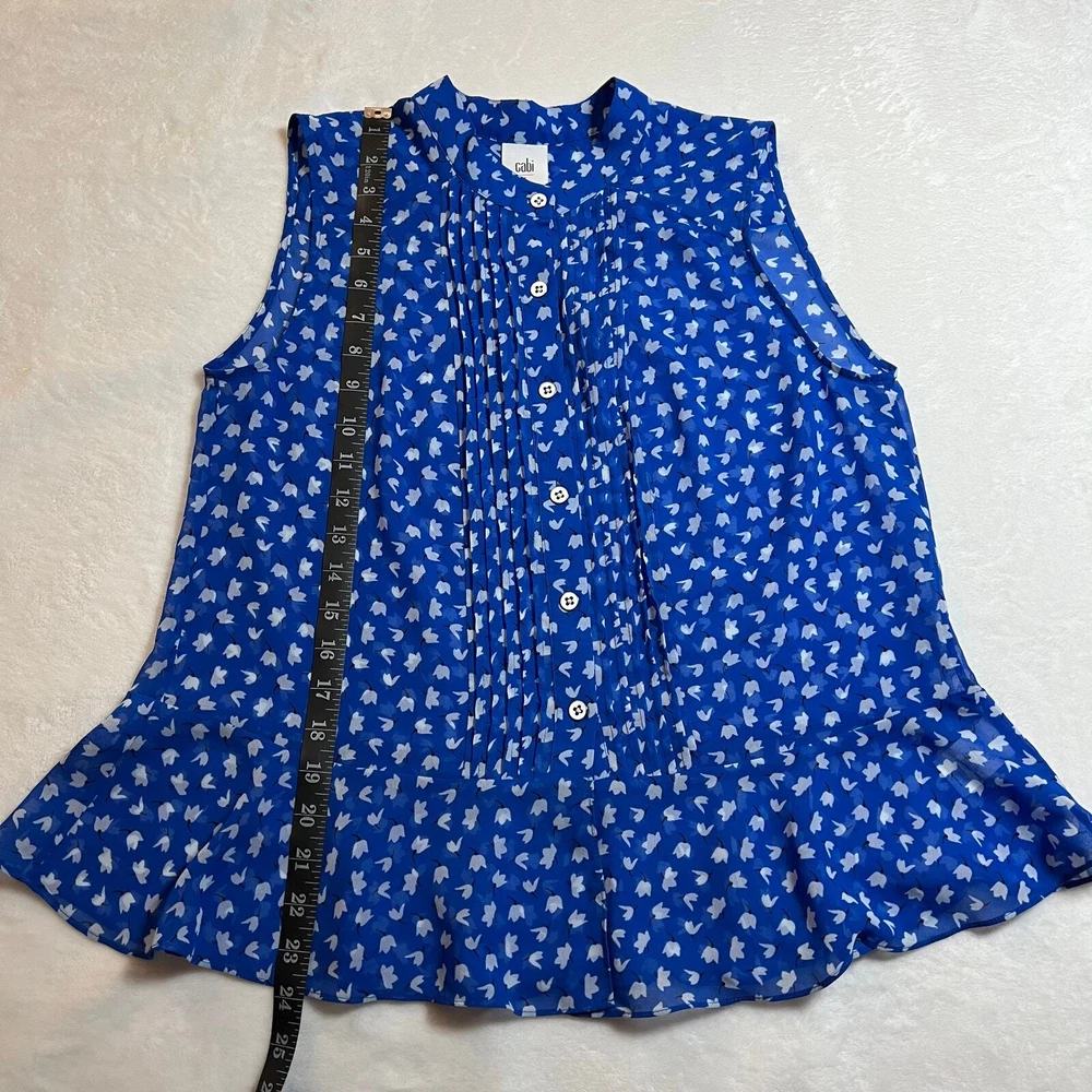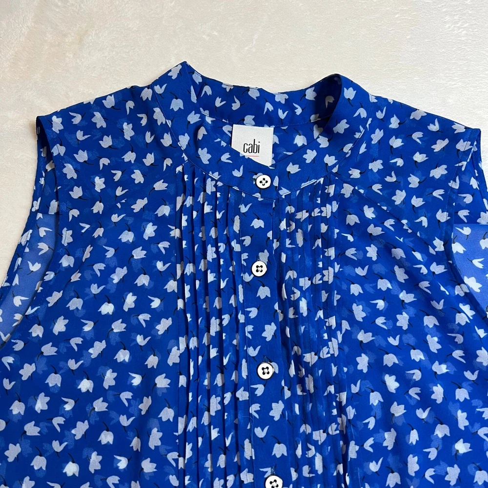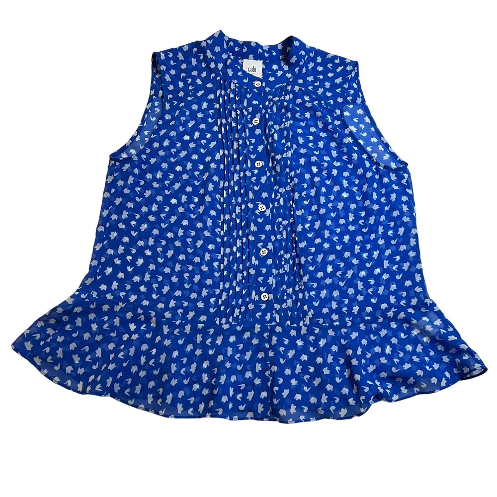 CAbi Sleeveless Floral Print Button Down Peplum Blouse Size S Style # 5530 CONDITION: Pre-Owned. Gently Used Condition. FLAWS/ALTERATIONS: There are two long snags on the blouse. Please see the last pictures. COLOR: Electric Blue/White/Black SIZE: Women’s Size Small DETAILS: Sleeveless Semi sheer Floral print Button down Pintuck pleat detail Peplum Flowy MEASUREMENTS: Chest: 19.5" Full Length: 24" **All measurements are approximate and are taken flat** MATERIAL: 100% Polyester Bundle 2 OR MORE items to save more! Reasonable offers are welcomed! TAGS: Casual Comfy Spring Summer Travel Vacation Contemporary Maximalist Office Professional Career Resort