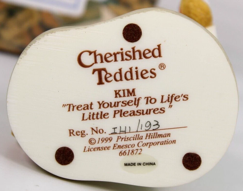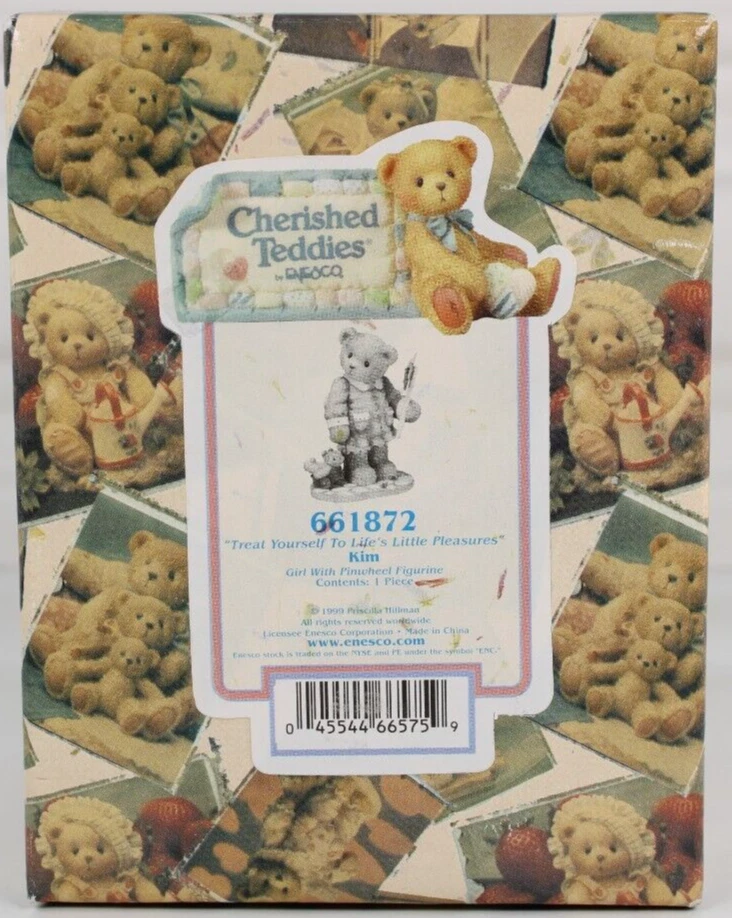 CHERISHED TEDDIES 1999 TREAT YOURSELF TO LIFES LITTLE PLEASURES KIM FIGURINE NEW #661872 BEAUTIFUL COLLECTIBLE CHERISHED TEDDIES FIGURINE BY ENESCO TREAT YOURSELF TO LIFES LITTLE PLEASURES! ✨ KIM WITH PINWHEEL FIGURINE ✨✨✨ THE PINWHEEL ACTUALLY SPINS VINTAGE YET BRAND NEW NEVER OPENED PREVIOUSLY HAD BEEN IN STORAGE AT A RETAIL WAREHOUSE FOR OVER 20 YEARS WE UNBOXED TO INSPECT FOR CONDITION AND PHOTO COMES WITH ALL ORIGINAL PAPERWORK INSERTS HAND NUMBERED LIMITED EDITION ARTIST PRISCILLA HILLMAN BOX IS IN VERY GOOD CONDITION ✨ GREAT PAINT AND AMAZING DETAIL HANDCRAFTED HANDPAINTED COLLECTIBLE FIGURE IS IN LIKE NEW CONDITION #661872 - 1999 VINTAGE WOULD MAKE AN AWESOME GIFT! ADD TO YOUR COLLECTION Will ship to you with great care. Will ship to the United States and Protectorates via USPS International shipments will ship via Ebay's Global Shipping Program (GSP) International packages will ship within one business day to eBay's GSP. eBay's GSP will then ship the package internationally. Handling and Shipping times may vary with GSP. Brought to you by The VinKris Collection
