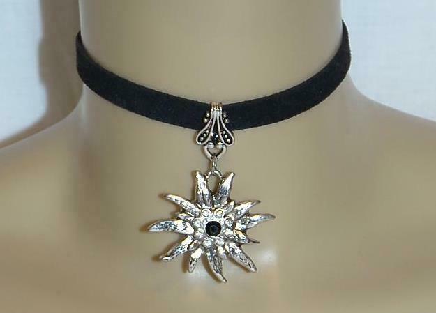 <> <> <> <> <> <> NEW In BOX * TRACHTEN CHOKER * ALSO Available In Store We Have A Matching Bracelet & Pierced Earring Listed Separately In Our Store. <> <> <> <> <> <> <> Color Black Choker EDELWEISS Flower Pendant Has 8 Clear Rhinestones and One In The Middle That Is Black ******************* Would Be Great To Wear For OKTOBERFEST With Your Dirndl :-)) & With A Nice Dress, Pants or Jeans * NEW * ******************* *** Size *** The Black Choker Band: 13" Long Extension: 2" Long *** Condition *** No Flaw's *** New *** # CHOKER #3 /