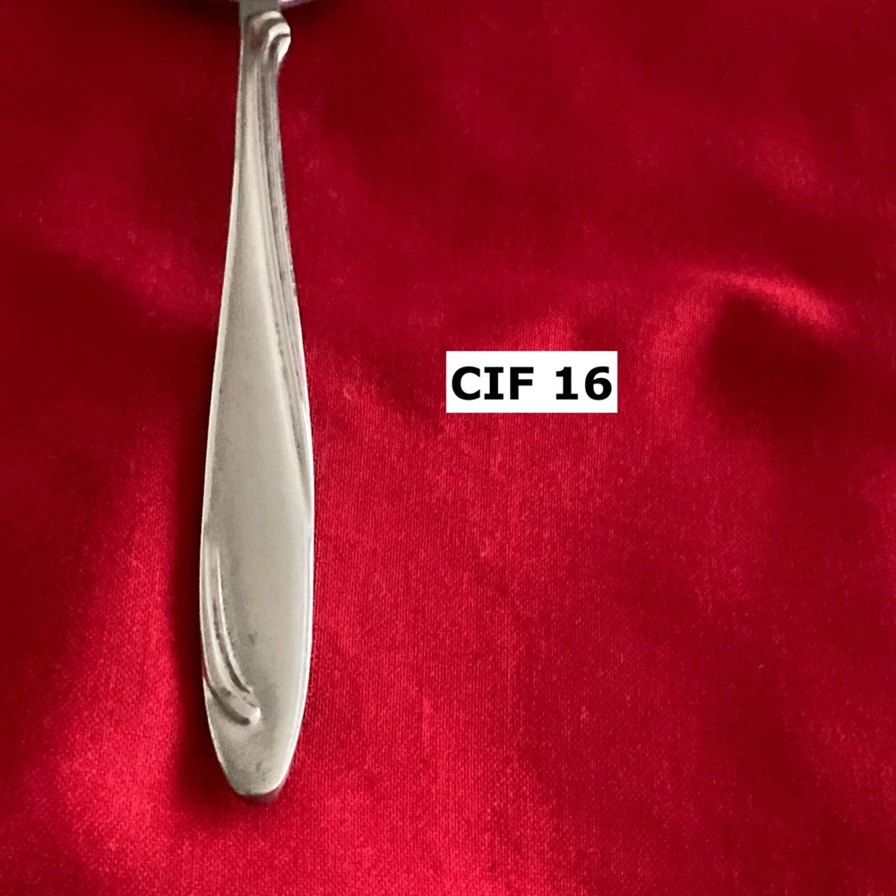 Manufacturer: CI Pattern: CIF 16 - Swirls Type: Stainless Steel Piece: Soup Spoon Length: 7 1/4" ruler not included