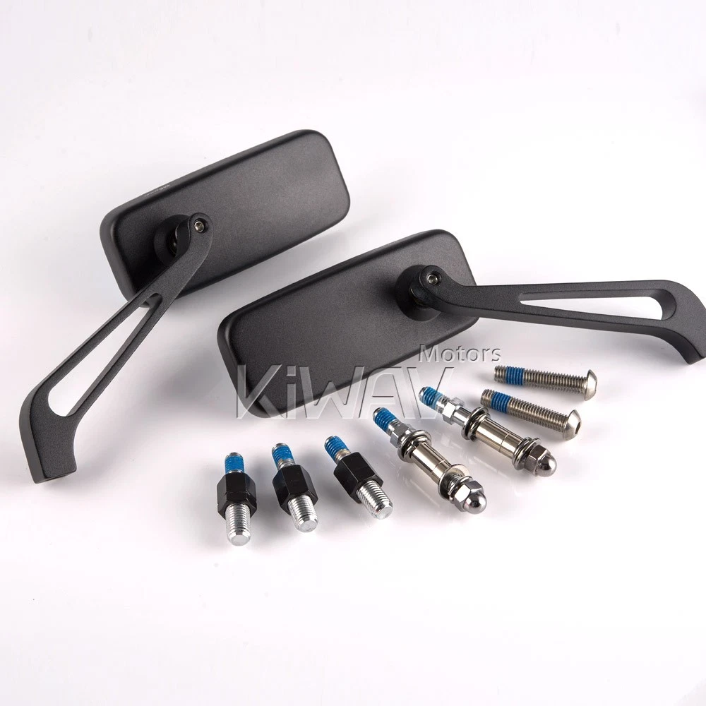 "I have ordered many different mirrors and these are the most amazing quality, price, and look. I don't know why anyone would waste their money on anything else out there. They are built like a tank, stay exactly where you last positioned them, and the tint definitely helps with the headlight glare from other cars. I would buy these and suggest them to others any time." Magazi Black rectangular mirrors motorcycle sportster bobber cruiser street naked road bike KiWAV WARNING: Colors may vary depending on monitor profiles and printer settings. Video We have clear mini videos which shows more details and helps to visualize your modification before actually having it on hands. Your browser doesn't support HTML5 video. Download the video . Measurement Please must check the measurement before making final decision. Please allow measuring deviation due to manual measurement. Item size measurement graph Specification SKU: 100102018260003 Features Another choice. From the stock mirrors. Mirrors are compatible for Harley Davidson underbar, no flip kit required. (Not for every Harley though, please check your rear view angle to decide.) The mirror plate and stem are constructed very well with CNC machined 6061 aircraft aluminum. About half the size of the OEM mirror. The simple & basic design makes your bike a little bit fresher as you can see. Always look good from any direction. Sleek and neat, up or down. Material CNC milled aluminum Shape Square Glass Anti-glare blue tinted convex lens Weight n.w.: 400 g / 0.9 lbs (pair), g.w.: 780 g / 1.7 lbs (total package, packing inclusive) Color Black Adjustment Fairly adjustable Package A pair of mirrors (left hand / right hand), 8mm to 10mm standard thread adapter x 2 PCS, 8mm to 10mm reverse thread adapter x 1 PC, 5/16" thread adapter x 4 PCS Compatibility 10mm(1.25 pitch): Universal compatible for 10mm thread motorcycles. Compatible for Harley Davidson '21 later Revolution® Max engine-equipped models, Nightster, Pan America, etc. 5/16": Compatible for most Harley Davidson. (except XG street models). Compatible for BMW R18 series models. aprilia BMW BSA Buell DUCATI Harley Davidson Honda Husqvarna Hyosung Indian Kawasaki KTM KYMCO MOTO GUZZI MV Agusta Norton Suzuki Triumph Victory YAMAHA KiWAV, kiwavMirror, kiwavmotor, motorcycle, kiwavClassic, naked, mat, black, 10M, 5/16inch Because of the small dimensions of the mirror glass, this product must only be fitted for racing or show purposes. How do I know if these mirrors fit my bike? If you're not sure, there are a few tips for you. Q: How do I know the size of my mirror thread? Please remove your current stock mirror and measure the diameter of the bolt. Q: How do I know the mirror thread pitch of my bike? Most big bike mirror thread is 1.25mm pitch, there are certain BMW big bikes mirror thread is 1.5mm pitch. Here's how you could measure: Use a vernier caliper. Find a screw that you're sure is 1.25mm pitch. Try to compare the mirror thread of the two. If it fits, it will look like this. Rule of Thumb Most big bike mirrors have 10mm standard/clockwise thread. Some Yamaha/Ducati, however, have a reversed/anti-clockwise thread and a standard/clockwise thread. Reverse thread mostly found on the right hand side mirror (view from the bike seat). These 5/16" bolts are for Harley-Davidson only. 8mm are for most scooters' mirrors. Some Yamaha scooters have a reversed/anti-clockwise thread and a standard/clockwise thread. Reverse thread mostly found on the right hand side mirror (view from the bike seat). Check the bolt area of your bike, and the bottom of our mirror stem to see if they fit. Check with your motorcycle dealer, motorcycle forum or Google for the correct mirror thread. We Recommend About "Every ride has its own personality, its own visual identity." With this in mind, Magazi has gone the extra mile to bring cosmetic individuality to its product proposition. An extremely dynamic designer , producer and supplier of mirrors for all type of motorcycles , Magazi's dedicated team of professionals has managed to strengthen and consolidate a brand that for many , is synonymous with flexibility and competitiveness. Magazi's efforts to bring is quality brand to a market that is highly competitive has depended hugely on its ability to produce a range of cost-effecetvie mirrors that has superior design attributes. Payment & Shipment We accept the following forms of payment: PayPal, and credit or debit card through eBay. For E-check payment, shipment will be made until PayPal indicates payment clear. We appreciate immediate payment. If payment is not received within 4 days after auction ended, unpaid item ( UPI ) will be automatically turned on to get the final value fee back. 24 hours Shipment will be arranged within 24 * hours after payment cleared. *Taiwan business days only. Shipping to address We ship to the address provided at checkout to comply with eBay policy. *If you need to change the address, please cancel the order before it ships and place a new one with the correct address. Warehouses We have 3 warehouses, Taipei, Taiwan; United States; Australia. Signature upon delivery Most shipping services we use may require a signature upon delivery. If you have special delivery requests, please let us know BEFORE placing your order. While we do our best to accommodate these requests, final delivery procedures are ultimately determined by the carrier. Wrap & Protection All items will be carefully wrapped for best protection. Duty / Tax Buyer is responsible for import duty/ tax if applicable. Important Tax & Customs Information for EU & UK Buyers eBay collects VAT at checkout for orders under the respective thresholds ( €150 for the EU and £135 for the UK ). For orders above these thresholds, you will be responsible for paying import duties, VAT, customs fees, and any other applicable charges directly to your local customs office or courier upon delivery . France is an exception, where eBay collects VAT 
