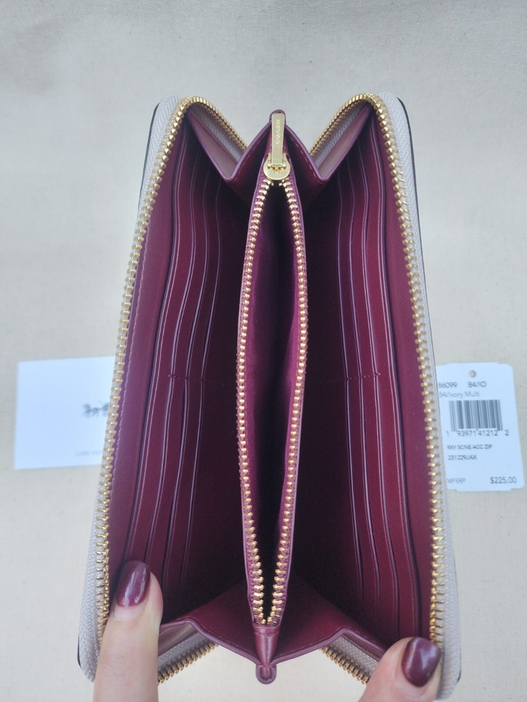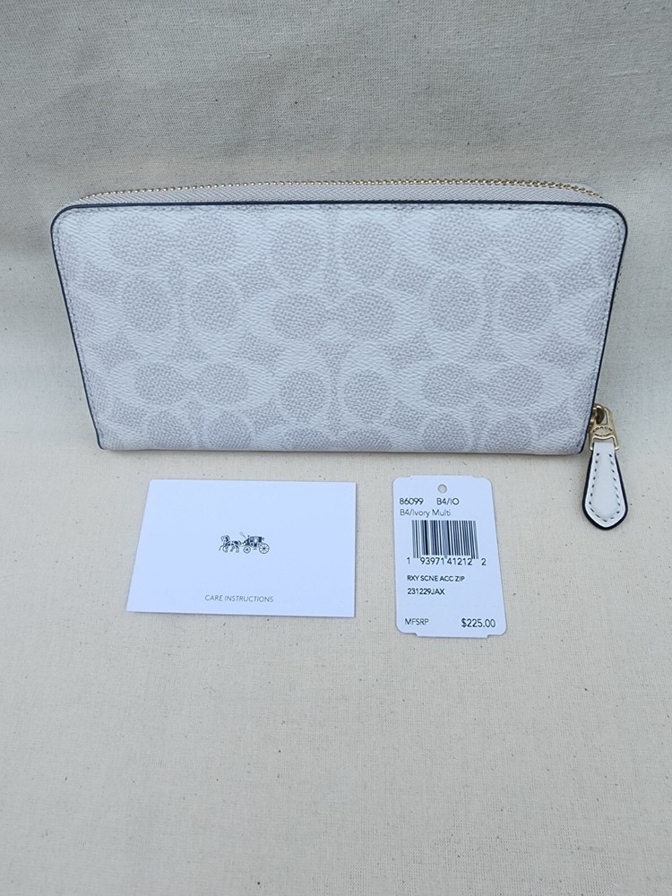 100% AUTHENTIC COACH ACCORDION ZIP WALLET IN SIGNATURE CANVAS WITH 🦖 REXY🦖 (COACH 86099) BRASS/IVORY MULTI COACH STYLE #86099 SIGNATURE COATED CANVAS, TWELVE CREDIT CARD SLOTS, FULL-LENGTH BILL COMPARTMENTS, ZIP COIN POCKET, ZIP AROUND CLOSURE 7 1/2"(L) X 4"(H) X 3/4" (W) FITS ALL PHONE SIZES UP TO AN iPHONE X AND SAMSUNG S7 EDGE STYLE NO. 86099 COACH MSRP:$225.00