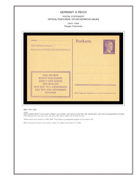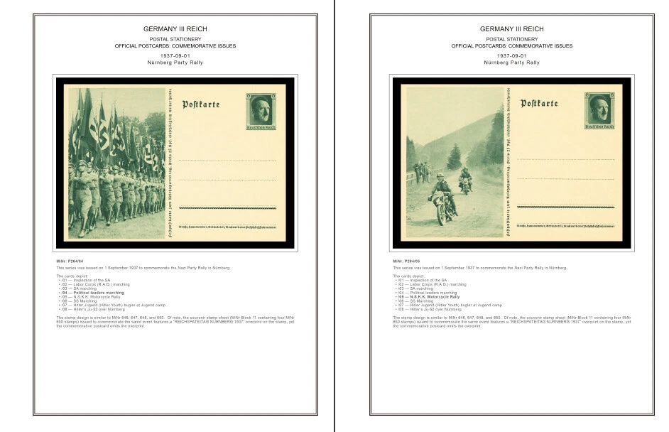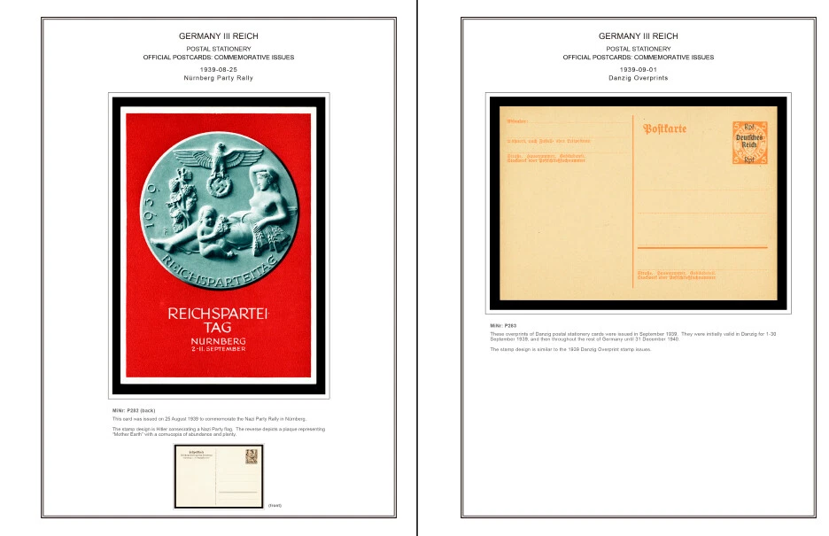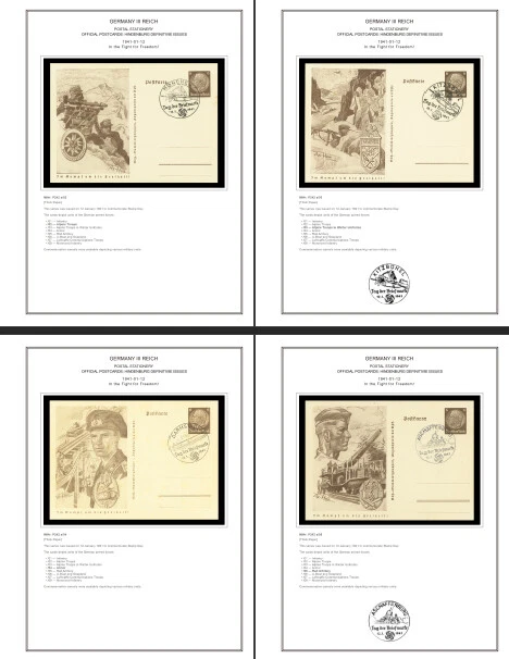 GERMANY III REICH STATIONERY: OFFICIAL POSTCARDS [ Postkarte Deutsches Reich | Vol.01: Hindenburg Definitives+Airmail Issues+Hitler Definitives & Vol. 02: Commemorative Issues ] 1933-1944 COLOR PRINTED STAMP ALBUM PAGES (169 pages) Full color printed pages f o r Germany III Reich official postcards 1933-1944 . The postcard illustrations are ordered chronologically and according to Michel catalogue. Top quality color stamp album pages printed on heavy stock 200 g/m 2 (75 lbs cover weight) acid-free couchet silky white paper. US letter size 8.5 x 11” . Technical Specifications: Country Germany (III Reich) Period 1933-1944 Print Full color Paper 200 g/m 2 (75 lbs) Nr. Pictures 169 (100% coverage) Package Weight 1/1.23 kg (2.20/2.71 lbs) NOTE: Info on postcard emissions, front /back illustrations and postmark pictures displayed (when/if available). Please note: These are full-color printed pages. They are NOT hingeless. For protection of both the pages and the postcards, we recommend using stamp mounts or similar instead of hinges. The pages are sent unpunched – this allows you to punch them as needed (for 2 or more ring binders). Black and white printing available on request. NO POSTCARDS INCLUDED. INTERNATIONAL STANDARD SHIPPING [Contact us first if you desire registered shipping or for shipping rates within Europe] [Stampextras won´t be responsible for losses under international standard shipping ] GERMANY III REICH OFFICIAL POSTCARDS 1933-1944