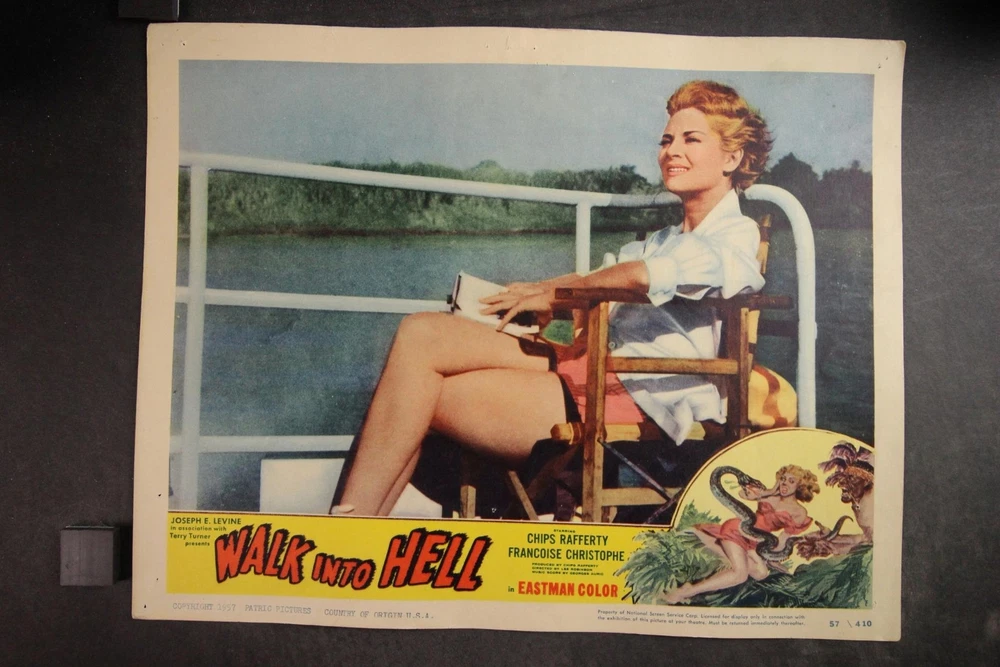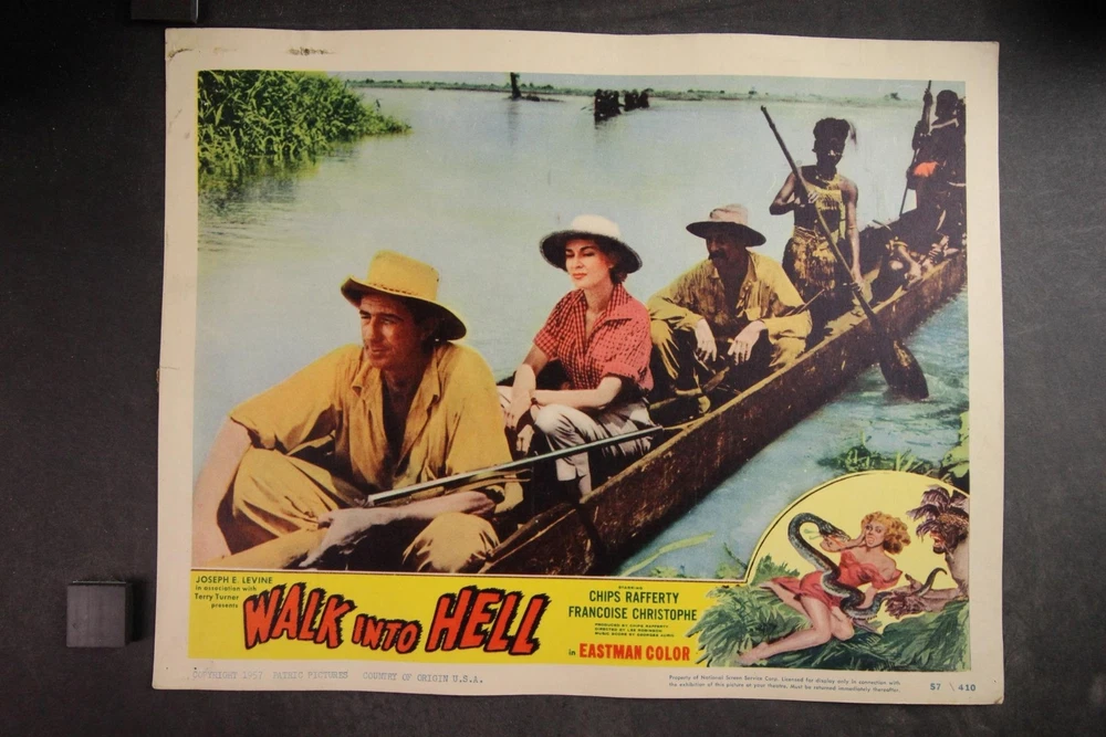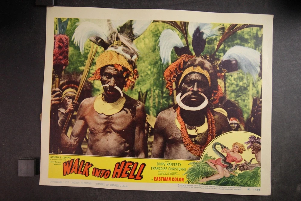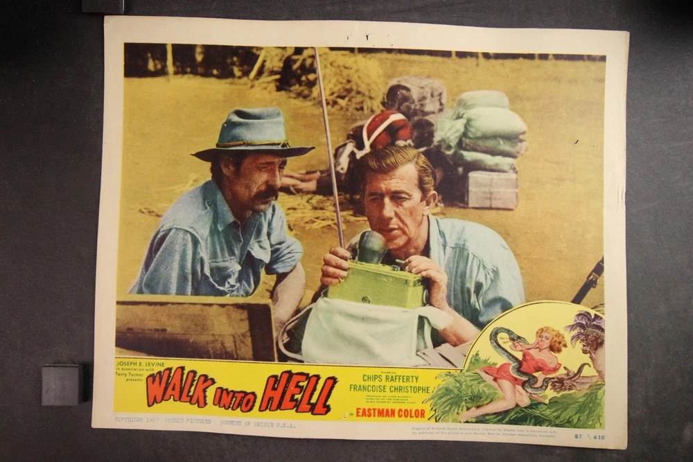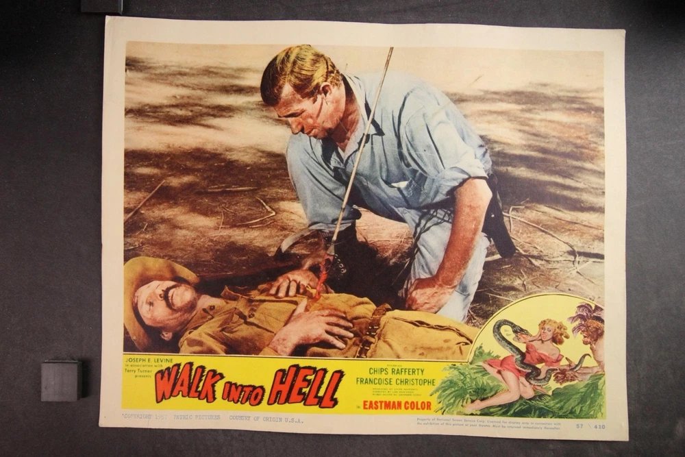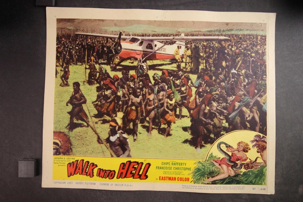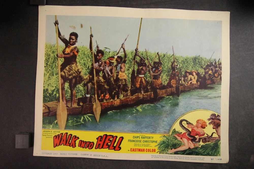 PLEASE LOOK BELOW DESCRIPTION FOR LARGE PHOTOS OF ITEM. ITEM : Complete set of eight original 1957 "Walk into Hell" movie lobby cards. CONDITION : Good condition cards with moderate corner/edge wear. Heavy pinholes. MEASUREMENTS : 11 x 14 inches. COMBINDED SHIPPING : I will Gladly combine shipping of items for up to 28 days. NO free shipping on lobby cards but I will keep the combined shipping cost as low as possible. Item History: The National Screen Service controled most of the movie advertising industry from the 1940s to the 1980s. They had regional warehouses to distribute material and accept returns of this material. The NSS officially closed in 2007. This auction offering comes from one of those regional warehouses. I purchase a large amount of inventory from a Chicagoland 40 yr movie memorabilia dealer. This dealer obtained this material at the closing of the NSS. Stay tuned for great offerings of 8 x 10 photos, lobby cards and posters directly from the NSS warehouse. Many items never distributed. HAPPY BIDDING & THANKS FOR LOOKING !!!! Please check out my other auctions ALL ITEMS are ORIGINAL, NO reproductions SHIPPING INFORMATION: * I will combine shipping. I don't mind waiting up to 28 days to help in combining items. I will forward an updated invoice with any additional wins with combined shipping. Just forward payment when finished bidding. * Winning bidder will pre-pay winning bid plus any postage/handling. * International bidders: First Class International available on most items under 4 lbs. Priority Mail International available on all items. Images sell! Get Supersized Images & Free Image Hosting Attention Sellers - Get Templates Image Hosting, Scheduling at Auctiva.com. Track Page Views With Auctiva's Counter