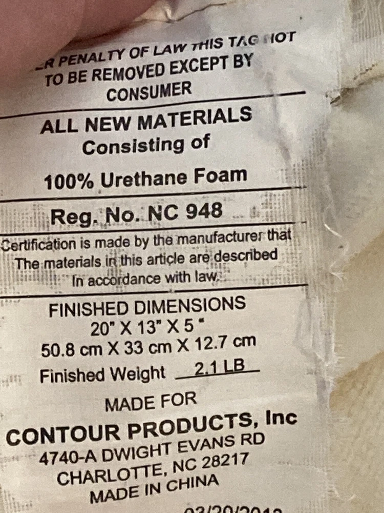 My husband's old CONTOUR PRODUCTS 5 Inch CPAP Pillow Memory Foam Washable Cover Used He tried it for a while with the CPAP and then went back to a regular pillow. Pillow itself is in good condition. Cover is off white with some yellowed stains that did not come out despite soaking the pillow cover in oxy clean and then sending through washing machine. See photos for details.