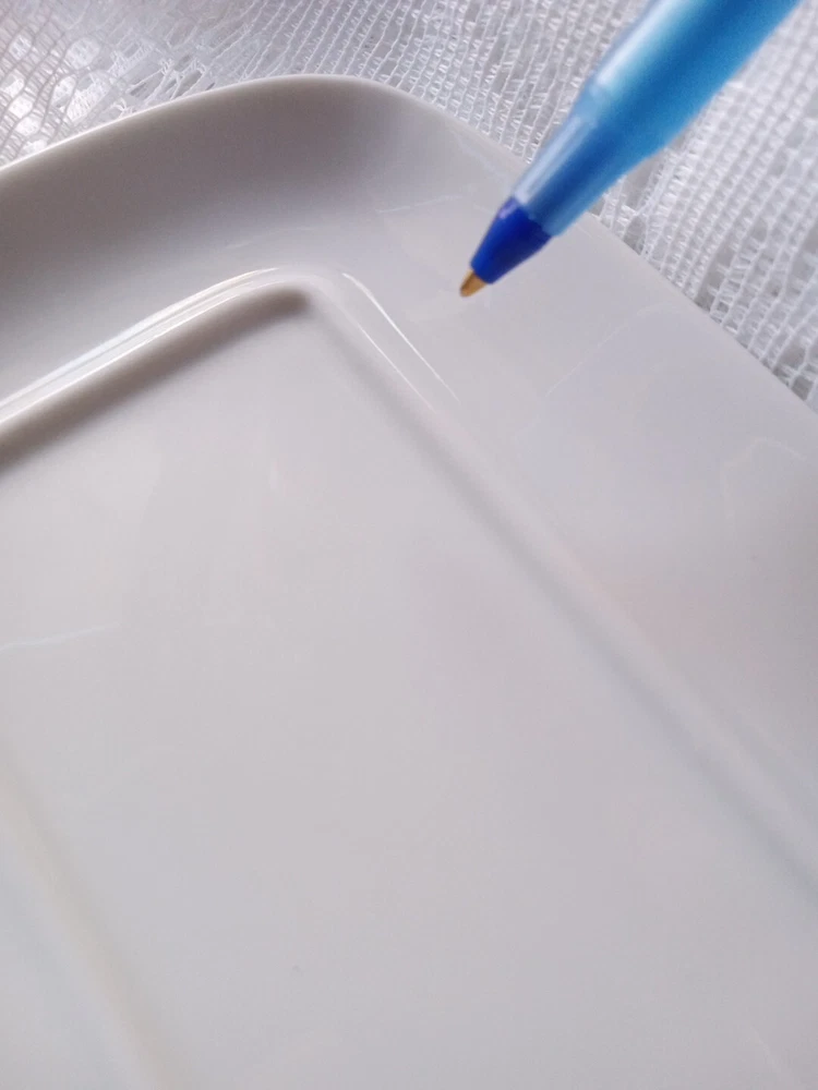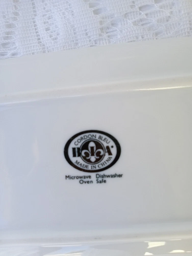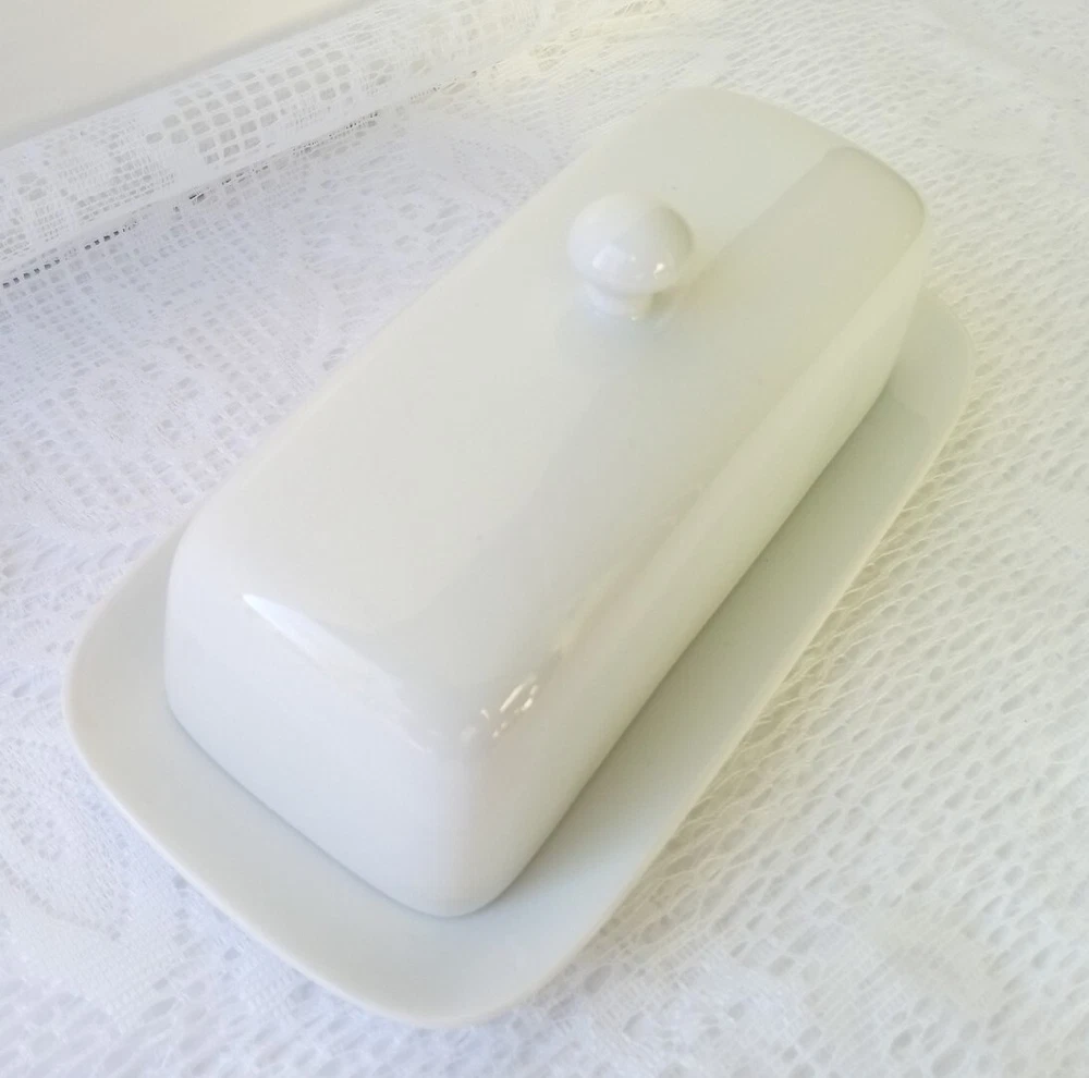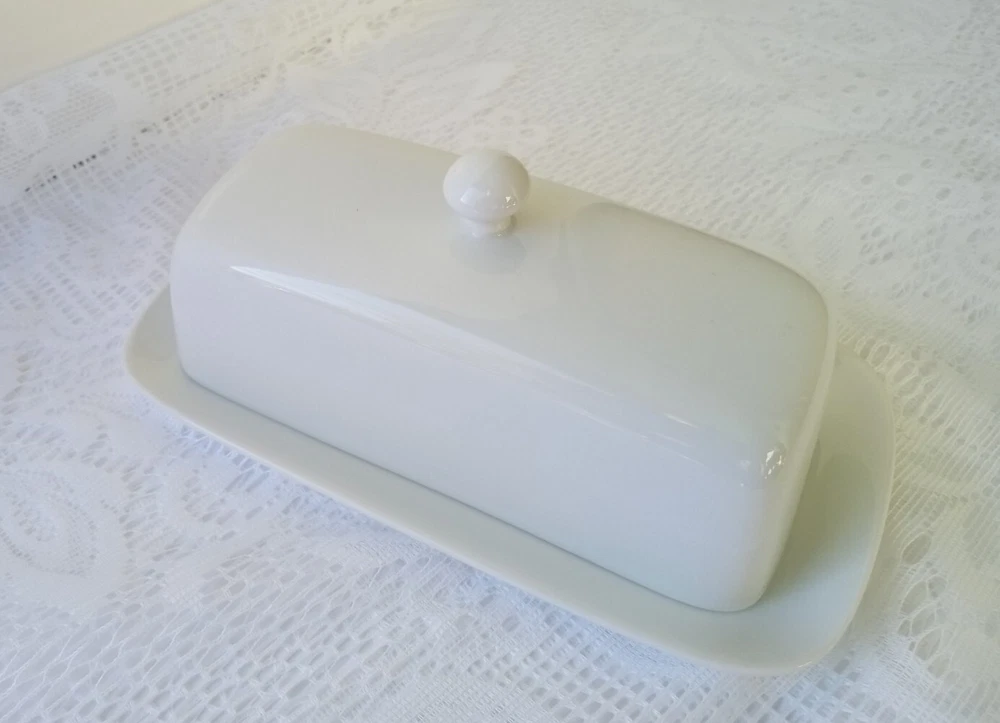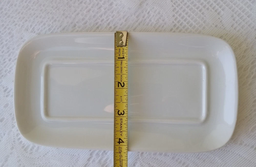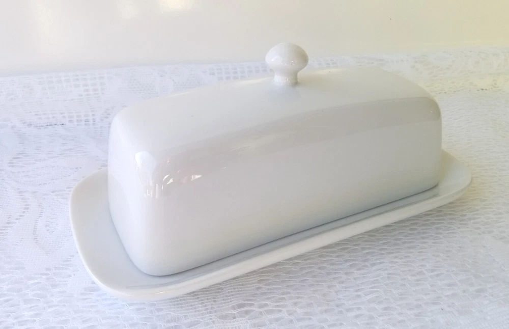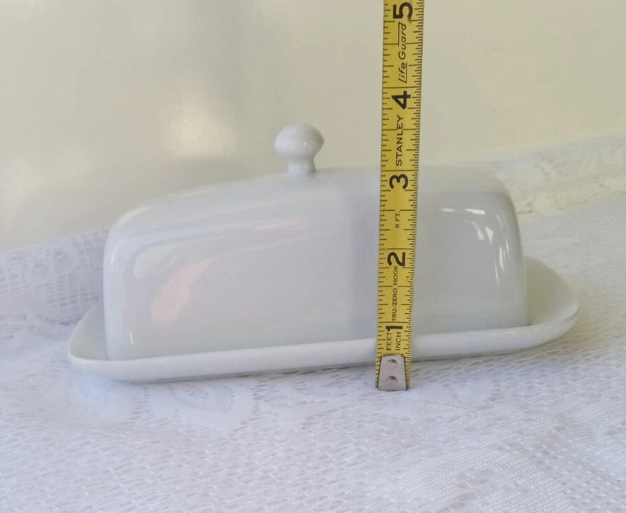 CORDON BLEU White Ceramic Butter Dish with Lid Measures approximately 8" length, 4 1/4" wide and about 3 1/2" tall with lid Overall very nice condition with no chips or cracks detected. There is a slight discoloration spot found on the platter edge (please see last picture). Packed with Care and Ready to Ship