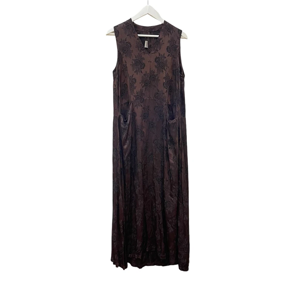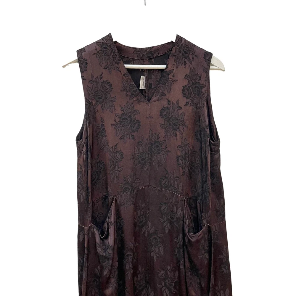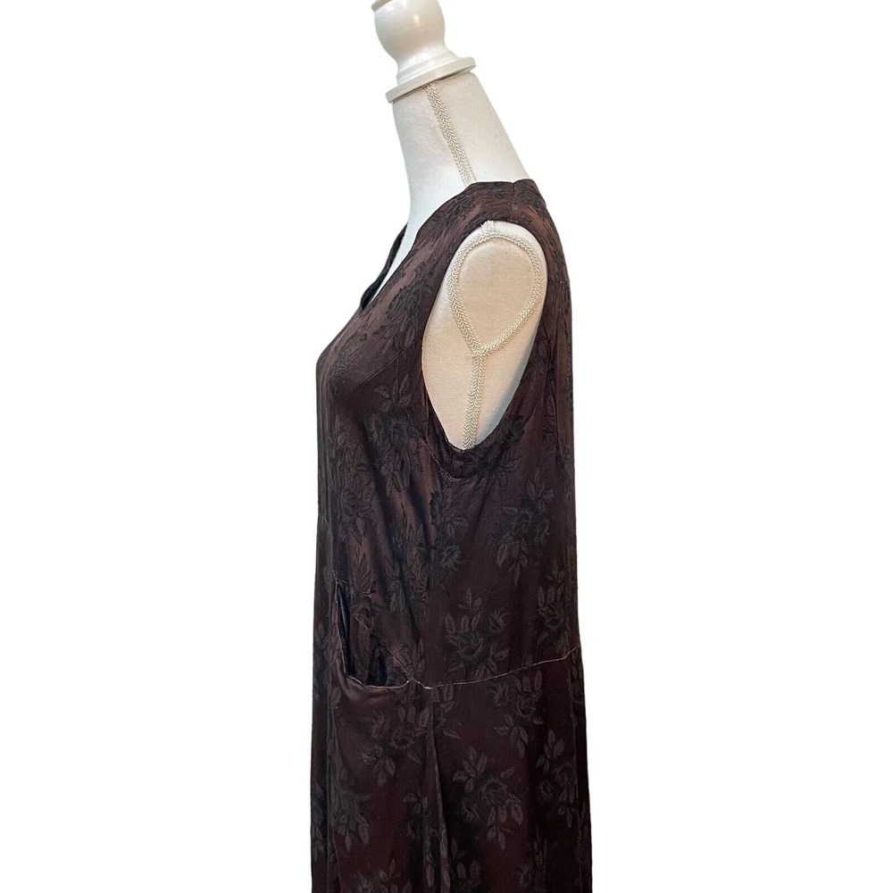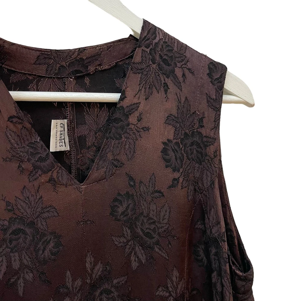 CP SHADES San Francisco Vintage Dark Brown Floral Rayon Brocade Sleeveless Lagenlook Maxi Shift Dress Dark brown with floral pattern Sleeveless Front slit pockets Relaxed silhouette 100% rayon No size, fits like a small/medium **SEE MEASUREMENTS** *Approximate measurements: Pit to pit- 19" Waist- 19" across Length- 52" *Good vintage condition. There is some pulling on waist seam