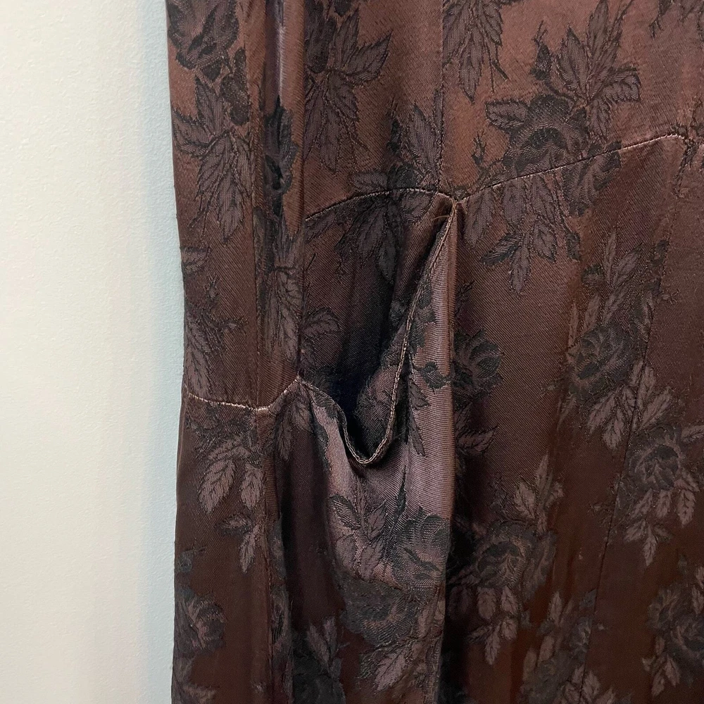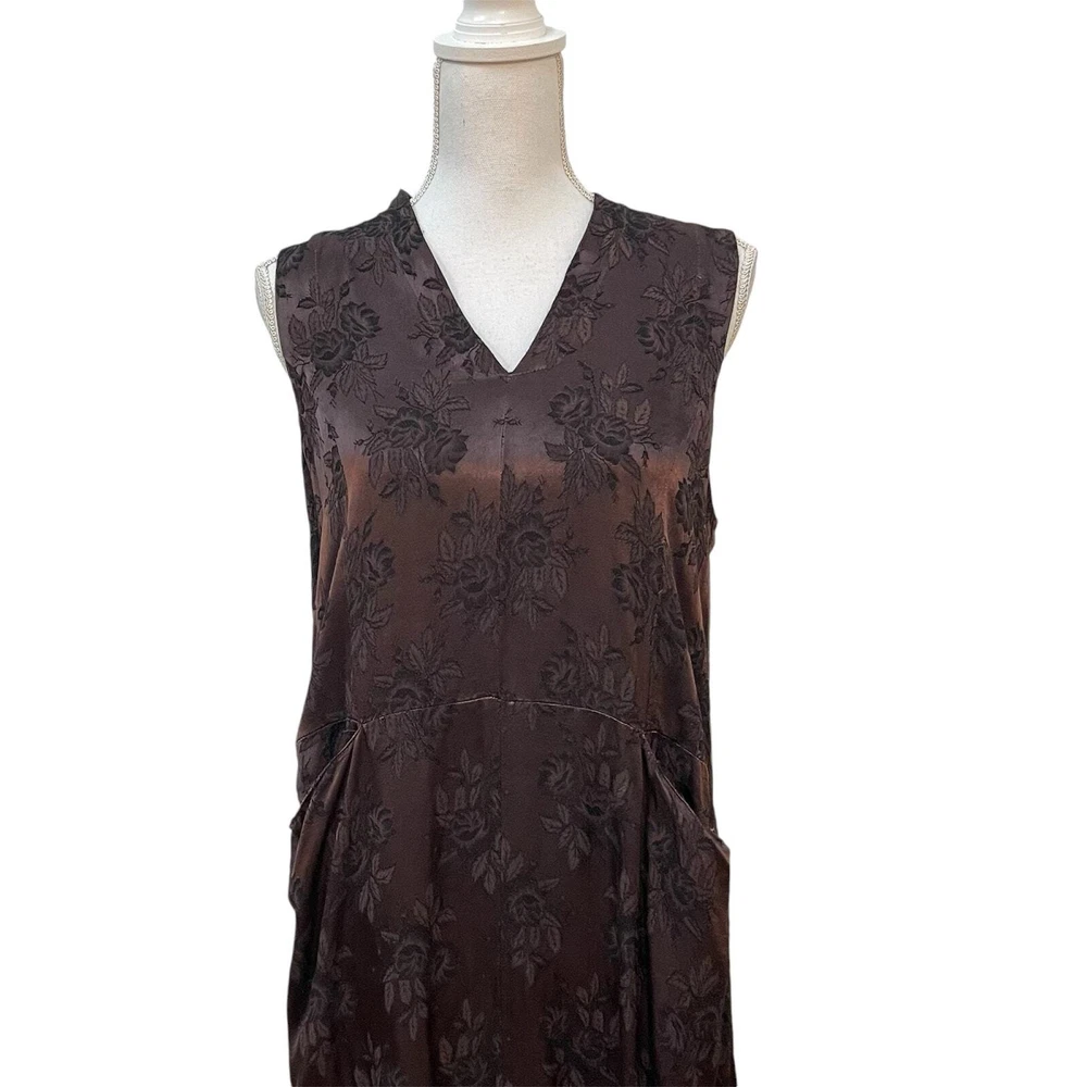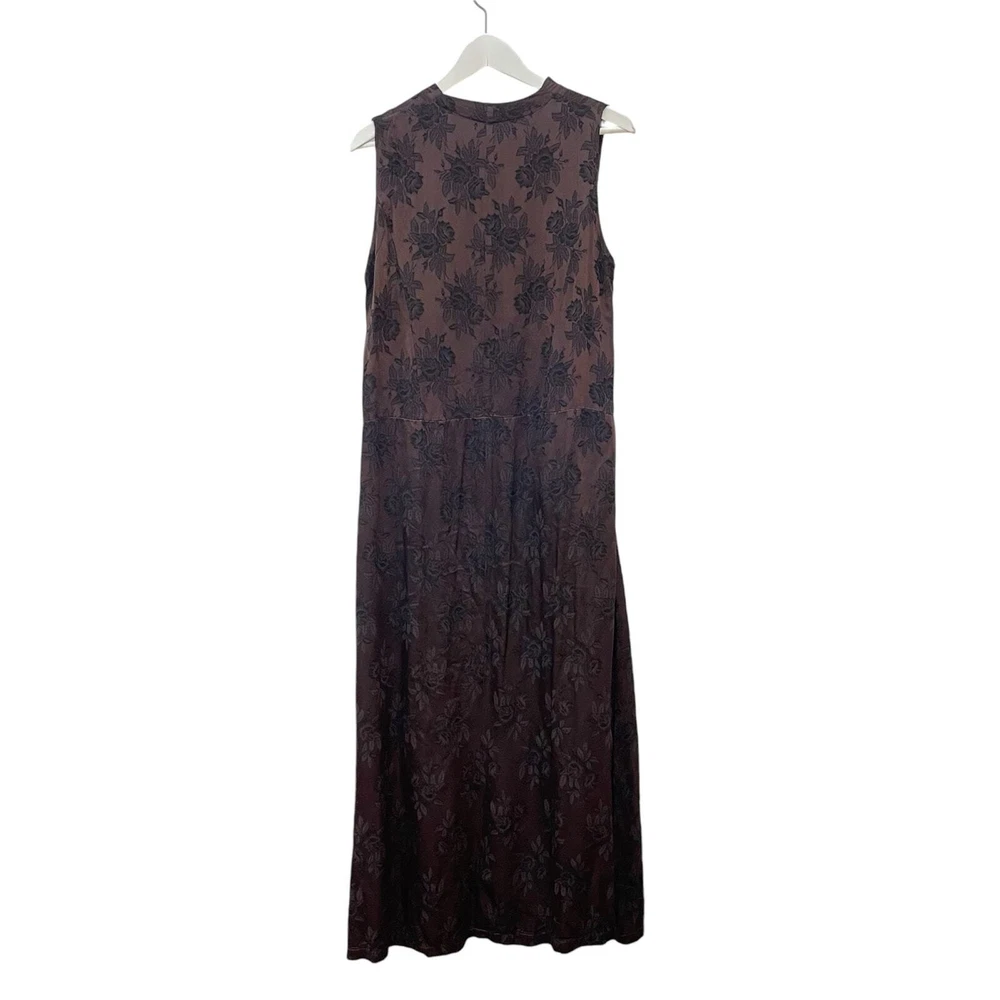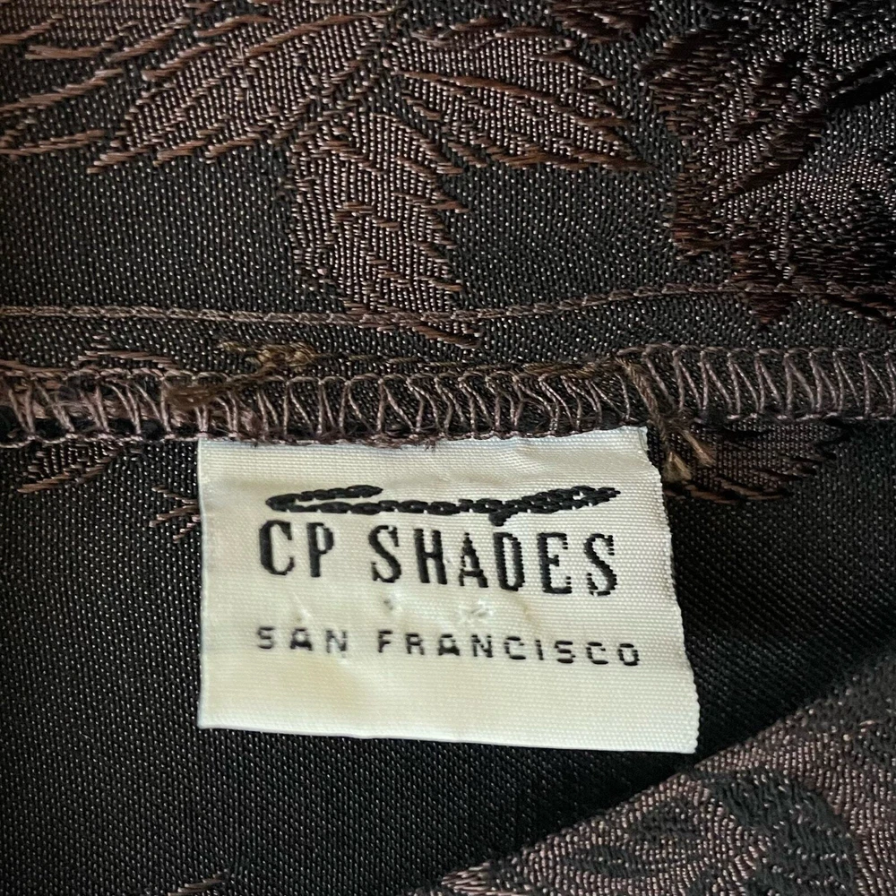 CP SHADES San Francisco Vintage Dark Brown Floral Rayon Brocade Sleeveless Lagenlook Maxi Shift Dress Dark brown with floral pattern Sleeveless Front slit pockets Relaxed silhouette 100% rayon No size, fits like a small/medium **SEE MEASUREMENTS** *Approximate measurements: Pit to pit- 19" Waist- 19" across Length- 52" *Good vintage condition. There is some pulling on waist seam