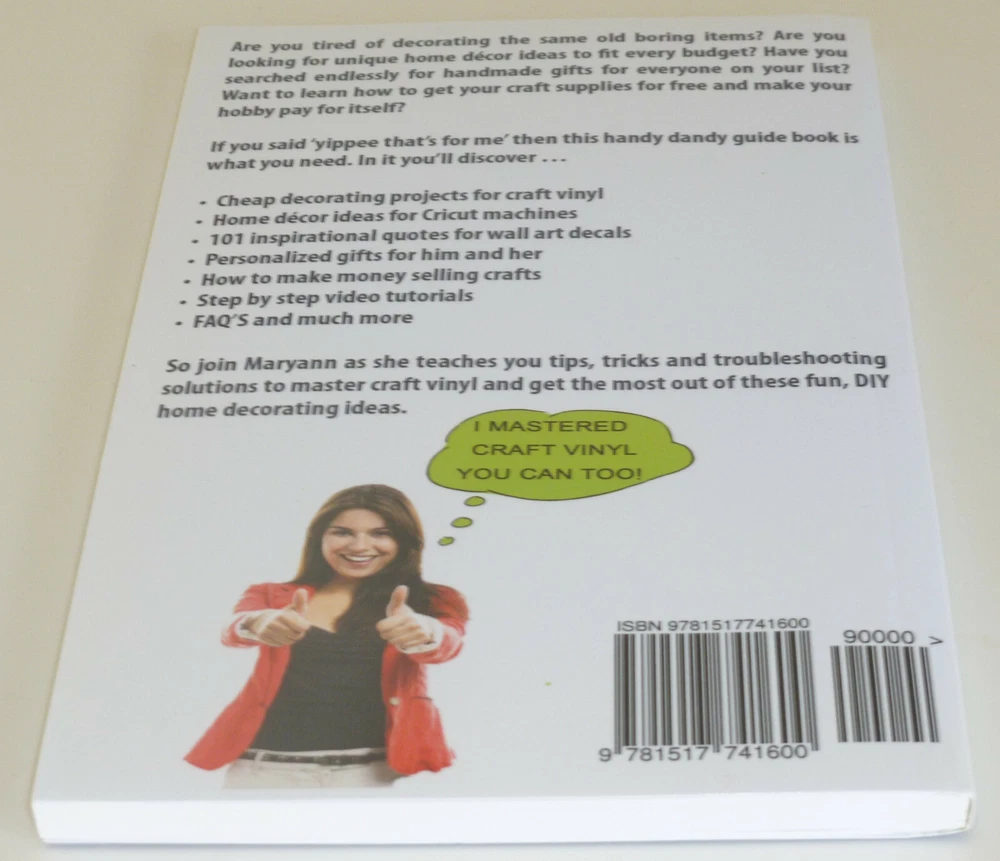 CRAFT VINYL DECORATING IDEAS GIFTS HOME DECOR MONEY MAKING TIPS GALORE HOW TO MASTER YOU CRICUT MACHINE ARE YOU TRIED OF DECORATING THE SAME OLD BORING ITEMS ? ARE YOU LOOKING FOR UNIQUE HOME DECORE IDEAS TO FIT EVERY BUDGET? HAVE YOU SEARCHED ENDLESSLY FOR HAND MADE GIFTS FOR EVERY ONE ON YOUR LISTS? IF YOU SAID YES YIPPEE THAT'S FOR METHEN THIS HANDY DANDY GUIDE BOOK IS WHAT YOU NEED. IN IT YOU'LL DISCOVER CHEAP DECORATING PROJECTS FOR CRAFT VINYL HOME DECOR IDEAS FOR CRICUT MACHINES 101 INSPIRATIONAL QUOTES FOR WALL ART DECALS PERSONALIZED GIFTS FOR HIM AND HER HOW TO MAKE MONEY SELLING CRAFTS STEP BY STEP VIDEO FAQ'S AND MUCH MORE SO JOIN MARYANN AS SHE TEACHES YOU TIPS, TRICKS AND TROUBLESHOOTING SOLUTIONS TO MASTER CRAFT VINYL AND GET THE MOST OUT OF THESE FUN, DIY HOME DECORATING IDEAS SHIPPING I WILL SHIP WITHIN 3 BUSINESS DAYS I DO NOT SHIP ON WEEKENDS. WE ONLY SHIP TO PAY PAL ADDRESSES. MAKE SURE THAT YOUR ADDRESS IS CORRECT. RETURNS RETURNS MAY BE SUBJECT TO 20% RESTOCKING FEE. ALL RETURNED ITEMS MUST BE IN THE CONDITION IT WAS RECEIVED. YOU MAY RETURN ALL ITEMS SOLD BY US WITHIN 14 DAYS OF DELIVERY. IF THE ITEM GET DAMAGED OR STOLEN DURING TRANSIT. WE WILL NOT BE HELD RESPONSIBLE. WE ARE NOT RESPONSIBLE FOR ANY SHIPPING COST IN RETURNING ITEM. THANK YOU AND HAVE A GREAT DAY
