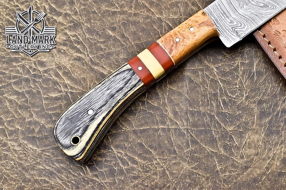 Custom Hand Made DAMASCUS STEEL KITCHEN CHEF KNIFE WITH PAKKA WOOD HANDLE We offer a shipping discount for More then one purchased . And discount will be apply on combine invoice, Discount will not apply on separate payment. ITEM DETAILS OVER ALL LENGTH 14.0 inches long (Approx) HANDLE LENGTH 5.0 inches long (Approx) BLADE LENGTH 9.0 inches long (Approx) BLADE HARDNESS 58-60 HRC Which Holds The Sharp Edge For Long Time. HANDLE PAKKA WOOD COVER LEATHER SHEATH This Awesome custom made KNIFE has a nice hand forged with the combination of 4340 & 1080 steel. HOW OUR DAMASCUS IS MADE: All our Damascus is real and not just an acid etch. Damascus is a mixture of 1080HC and 4340 nickel carbon. You heat them up together and then fold the bar over and over to get the desired layers, ours are 396 layers. Then you burn the blade in acid, and it turns the nickel satin color and the high carbon turns blackish gray. This is how the layers are exposed to show the layers of the new steel created coined "Damascus". All Damascus is acid etched to show the layers. If you high polish the metal it will be shinny satin like all steels. Only after you burn the sides of the blade with acid do you see the layers of the two steels. Makes sense? After we make our knives we high polish the handles and put an edge on the blade. The high polishing buffs off the acid burned layer of the handle, and the blade edge is sharpened and the acid burned edge becomes satin. You can re-burn the tang of the blade near the handles and the edge of the blade and it will show the layers once more. All our knives are hand made, durable and unique ***** YOU WILL RECEIVED THE SAME KNIFE Qality Standards Our Damascus blades are made from high quality non-stainless steels which rival or exceed any Damascus blade made from the 10 series with 4340. Our Damascus combination has taken years to perfect and has been tested under a variety of application which will offer professional performance in categories of toughness, strength (lateral stress) and edge honing and holding ability. In a 5 spot Rockwell test our blades will average near or close to 58 which offers a perfect balances between its toughness and strength.Our blades due to carbon content need to be regularly treated with wax and/or 3 in 1 oil to maintain its superior quality. Questions if you have any question feel free to send us message we aim to answer all questions within 24 hours Feedback If you are not satisfied with our service please contact us before leaving any negative or natural feedback. We will resolve all issues as quickly as possible. Disclaimer We are not responsible for any injuries associated with the use of our tools. Our products are intended for legal use only by responsible buyers. Therefore, we will not sell our products to anyone under the age of 18. Before bidding please check your country laws as some countries Custom don't allow this. If your purchase is held by Custom Authorities in your country/State we will not be responsible for that and no refund will be issued Shipping We offer a 20% shipping discount for More then one purchased . And discount will be apply on combine invoice, Discount will not apply on separate payment We ship within 24 hours after receiving complete payment but this can be delayed due to week ends or Governments and Religious Festivals . . This is beyond our control and we apologize for this inconvenience. Precautions Our Tools are very sharp so open and use them very carefully We are not responsible for any injuries associated with the use of our tools Tips to Care knife 1. NEVER STORE YOUR KNIFE FOR LONG TIME IN LEATHER SHEATH. 2. LEATHER CAN ABSORB WATER, WHICH WILL RUST THE KNIFE. 3. ALWAYS CLEAN THE BLADE AFTER USING WITH OIL OR WAX