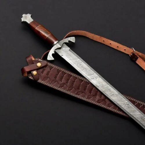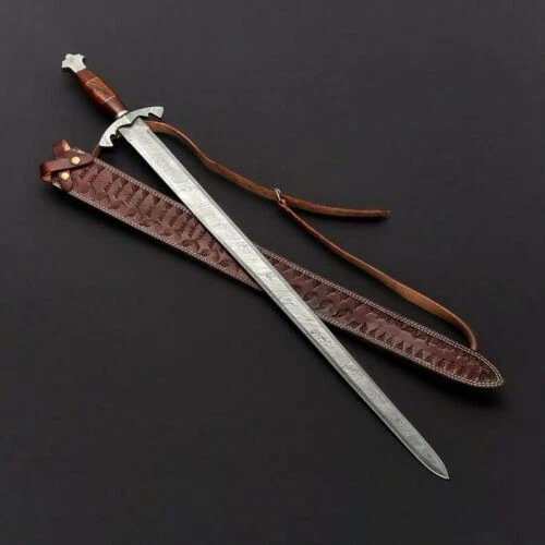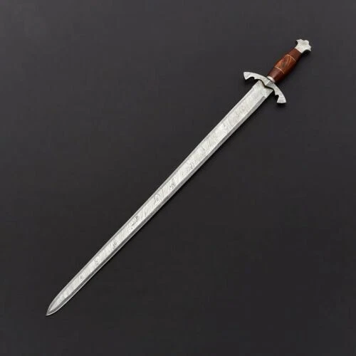 Materials DAMASCUS STEEL, BLACK HORN, LEATHER SHEATH Read the full description Description Hand Forged Celtic-Norse-Gladiator Sword- Medieval Viking Damascus Steel Custom Handmade Swords are individually hand forged in North America to look, feel and perform as the originals. Our ongoing commitment to painstakingly recreate each sword has made us popular among museum curators, collectors and re-enactment communities around the world. Hand-made with the finest material and forged from Damascus Steel. Our Medieval Viking Swords cater to the most discriminating collector, searching for a dependable and authentic medieval sword that are built to last. Features: Viking Sword Double Edge Free Leather Sheath Free Personalization Name or Runes or Logo Sword Size and Material Blade Material Damascus Steel Handle Material Black Horn Overall Length 32 inch typical Viking sword, this blade is ideally suited for a respectable and strong Viking Warrior. Classic and historical in its design, the Warriors Viking Sword with Scabbard is a straight-forward blade that was designed for war. This sword features a design that is typical of a classic Viking sword, featuring a large pommel to counterbalance the weight of a broad blade, as well as a narrow guard that is typically no longer than the width of the pommel. Where this blade differs is in its rich design. The pommel is a grand, subtly curved triangle shape with impressive textural designs, which are echoed and matched on the thick, gently curved guard. The grip is colored brown and wrapped to ensure a comfortable hold. The blade is straight and broad, featuring a deep fuller that runs the length of the blade, starting just above the guard and ending just shy of the blades point. Both the pommel and the guard are made from polished brass metal. Included with the sword is a matched scabbard, which features brass decorations along the throat, as well as a small brass chapel. The rest of the scabbard is brown, to match the swords grip. A Viking weapon could be considered a personal badge of honor, with greater weapons belonging to more noteworthy warriors. If that is the case, than this Warriors Viking Sword with Scabbard must be fit for a brave and highly skilled warrior indeed, as this is a weapon worthy of being openly displayed, both at your side and in your home