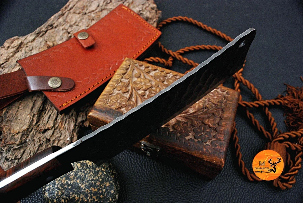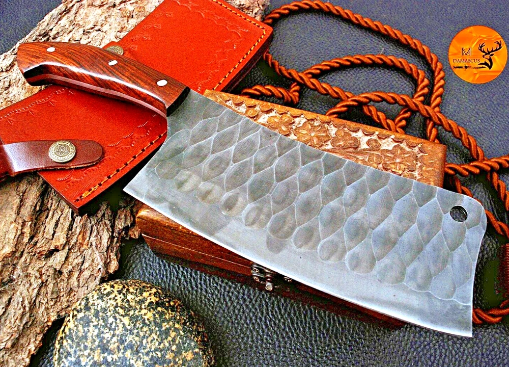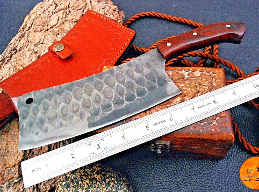 CUSTOM HAND MADE HIGH CARBON STEEL BLADE CHEF CLEAVER MEAT CHOPPER BUCHER KNIFE Wood Handle This superb design knifes is hand made. Blade of this knife has a nice file work . This robust knife is lab tested under intense conditions, the balance and shape of this knife ensures perfect grip. Overall Length: 12" Inches Blade Length: 7" Inches Handle Length: 5" Inches Sheath : Leather Hardness:55-58 HR Package Includes: with Sheath Care Instructions: Keep the knife dry after each cleaning. Warning: Take care when removing product from packaging. Keep fingers clear of blades. Store away from children.