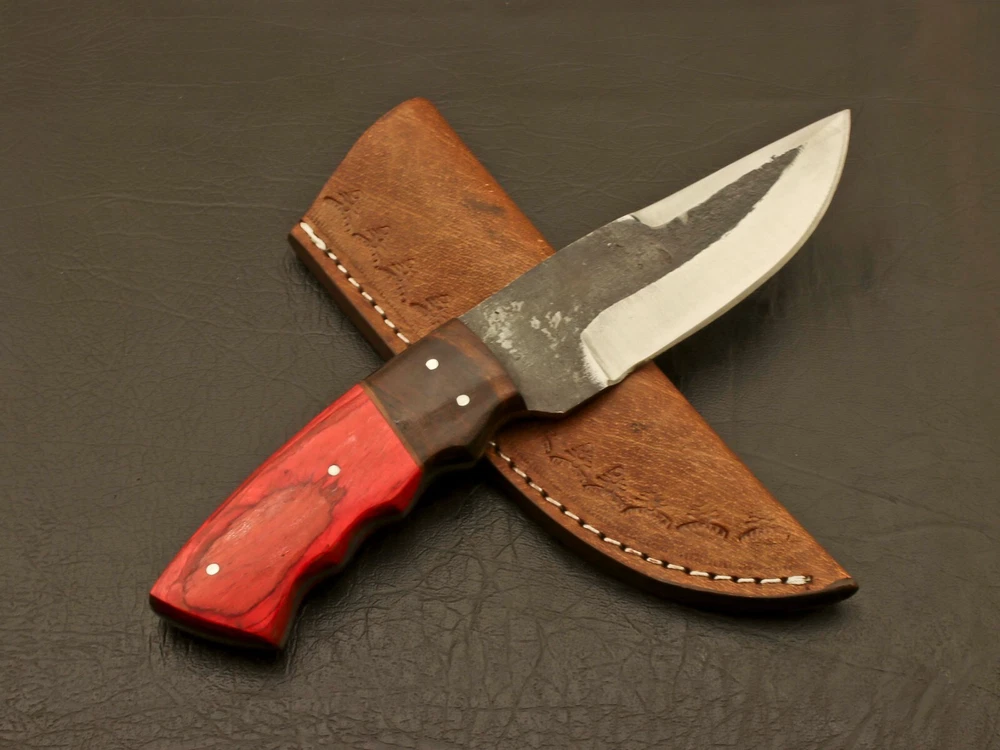 SUPERB LOOKING HANDMADE FORGED RAILROAD SPIKE CARBON STEEL FIXED BLADE KNIFE Superb Looking Handle of this Unique Knife is made of Beautiful Hard Wood & Rose Wood Scales fastened with steel pins and strong epoxy for life time durability. Blade has given excellent heat treatment and rock well hardness of the blade along its edge is 50 to 54 and along the spine is 42-45. All of our knives are 100% hand crafted. True quality material used to form the blade. The handle materials, blade steels, and leather sheaths are made professionally with no expense spared. Great handle fitting, exception sharp edge, nicely balanced grasp the best part? This hunting knife comes complete with a genuine leather sheath for easy storage and quick access, making it the perfect gift for anyone who loves outdoor activities, from camping and hiking to hunting and fishing. So why wait? Add this classic boot knife to your EDC kit today and experience the quality and craftsmanship that only a truly exceptional knife can offer. Overall Length: 8.5” Inches Blade Length: 4.5 ”Inches Handle Length: 4.0"Inches Handle Material : Wood Sheath : Leather Hardness : 58-60 HRC Care Instructions: Keep the blade dry after each cleaning. Warning : Take care when removing product from packaging. Keep fingers clear of blades. Store away from children. Complimentary gift messages *Gift wrapping service available for minimal additional fee ADD ONS: *Custom orders for 10 or more pieces. You can choose & submit your own handle or design. LIFETIME WARRANTY No premium knife is complete without a lifetime warranty; our masterpiece knife is fully covered for life, We do sell wholesale, please contact us for special discounts on bulk orders. FEEDBACK POLICY: YOUR FEEDBACK IS VERY IMPORTANT FOR US, IF THEIR IS ANY KIND OF PROBLEM PLEASE GIVE US OPPORTUNITY TO SORT THE ISSUE