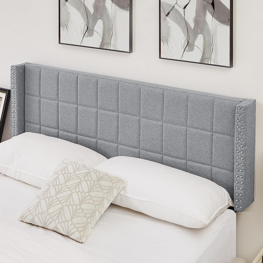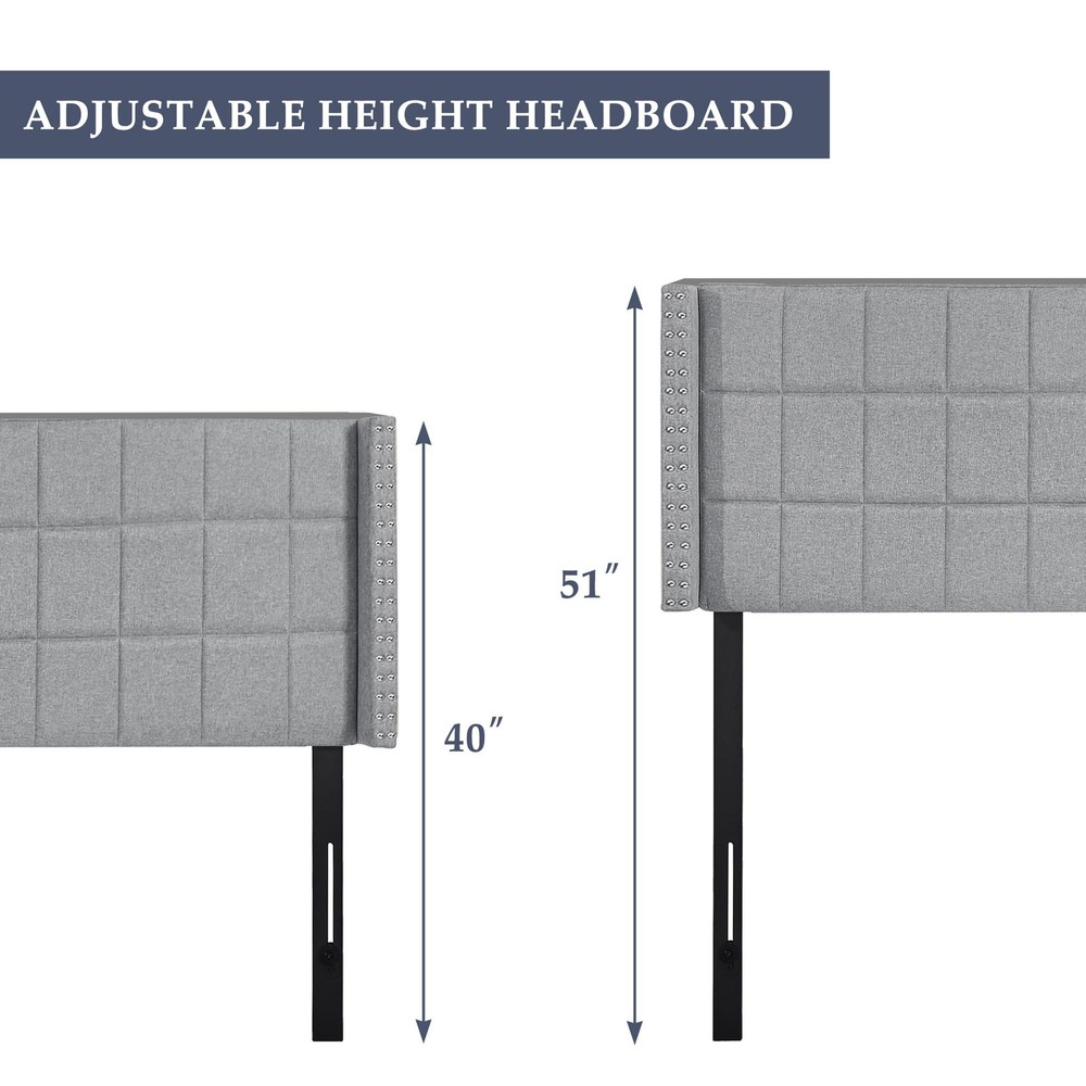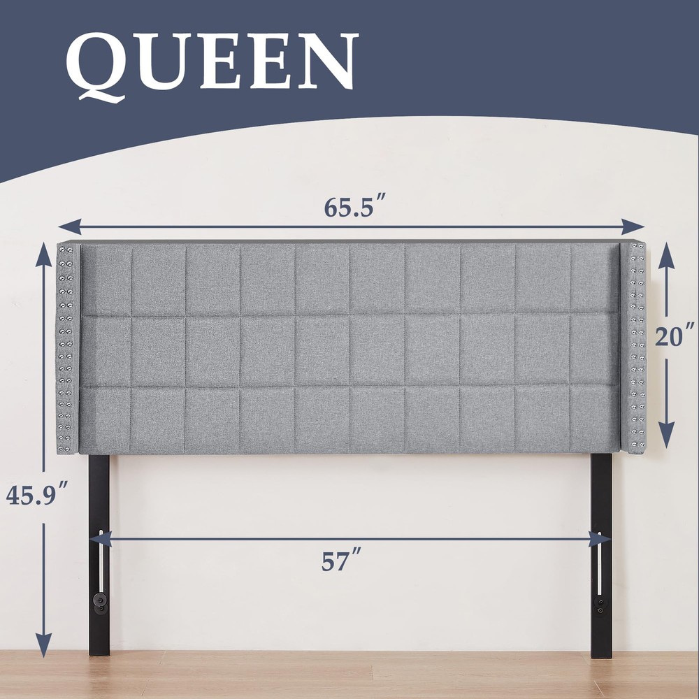 Description: Are you looking for an elaborate headboard for your bed? This linen headboard is worth a try. 6 adjustable options are suitable for accommodating queen or king-bed frames. The upholstered headboard combines breathable linen fabric and a soft sponge, providing comfortable back support for reading or watching TV in bed. This modern upholstered headboard adds a touch of sophistication, making it a perfect match for both contemporary and traditional decor. Features: Adjustable height to fit a queen or king-size bed. Breathable linen fabric provides a skin-friendly touch. A sponge-padded headboard for increased comfort. The solid rubberwood support legs are difficult to move. The modern and elegant appearance is suitable for various home styles. Pre-drilled holes in the legs of the headboard, complete with accessories and a clear user guide for easy assembly. Specifications: Color:Grey,Beige Material: Linen Fabric, Sponge, Rubber Wood, MDF. Overall Dimension: Queen:45.9x5.5x45.6"(L x W x H) King:81.3x5.5x45.6" (L x W x H) Leg Width: 2.36" Installation Slot Length: 9.05" Adjustable Height: 6 heights(40",42",43.9",45.9",47.8",49.8") Net Weight: Queen:24.25LB King:27.56LB Package includes: 1 x Adjustable Headboard. 1 x User Guide. All tools and bolts and screws are included. Distinctive Headboard: The tufted headboard features wingback and double nail-head decor which creates a chic look and matches well with interior decoration. Adjustable Headboard: The queen headboard is available in 6 optional adjustable heights. There are 2 sets of pre-drilled holes at the back, and 6 height-adjustable mounting positions from 40" to 49.8" in 3" increments, to fit most bed frames and bases. Premium Material: The queen headboard only fabric is made of premium linen, which prevents fading and provides a comfortable touch. The padded headboard is filled with high-density foam upholstery, creating a cushioned texture. The upholstered headboards will bring comfort to you and your family. Sturdy and Durable: The queen-size headboards are made of durable MDF Board, making it a durable and long-lasting addition to your bed. The legs are made of high quality powder-coated metal, which has high toughness and great distortion resistance. Don't worry about stability anymore! Easy To Assembly: Simply follow the instructions in the instructions to install the screws. The backboard comes with predrilled holes for easy attachment to any bed base. All tools and bolts and screws are included. Assembly takes 16 minutes or less. If you have any issues with the installation of the backboard for the bed, please don't hesitate to contact us.