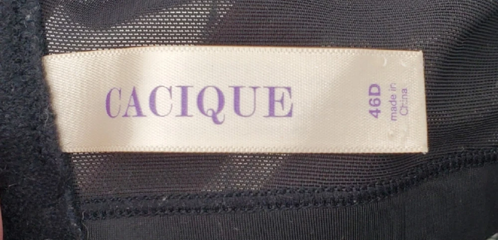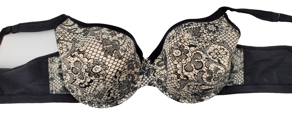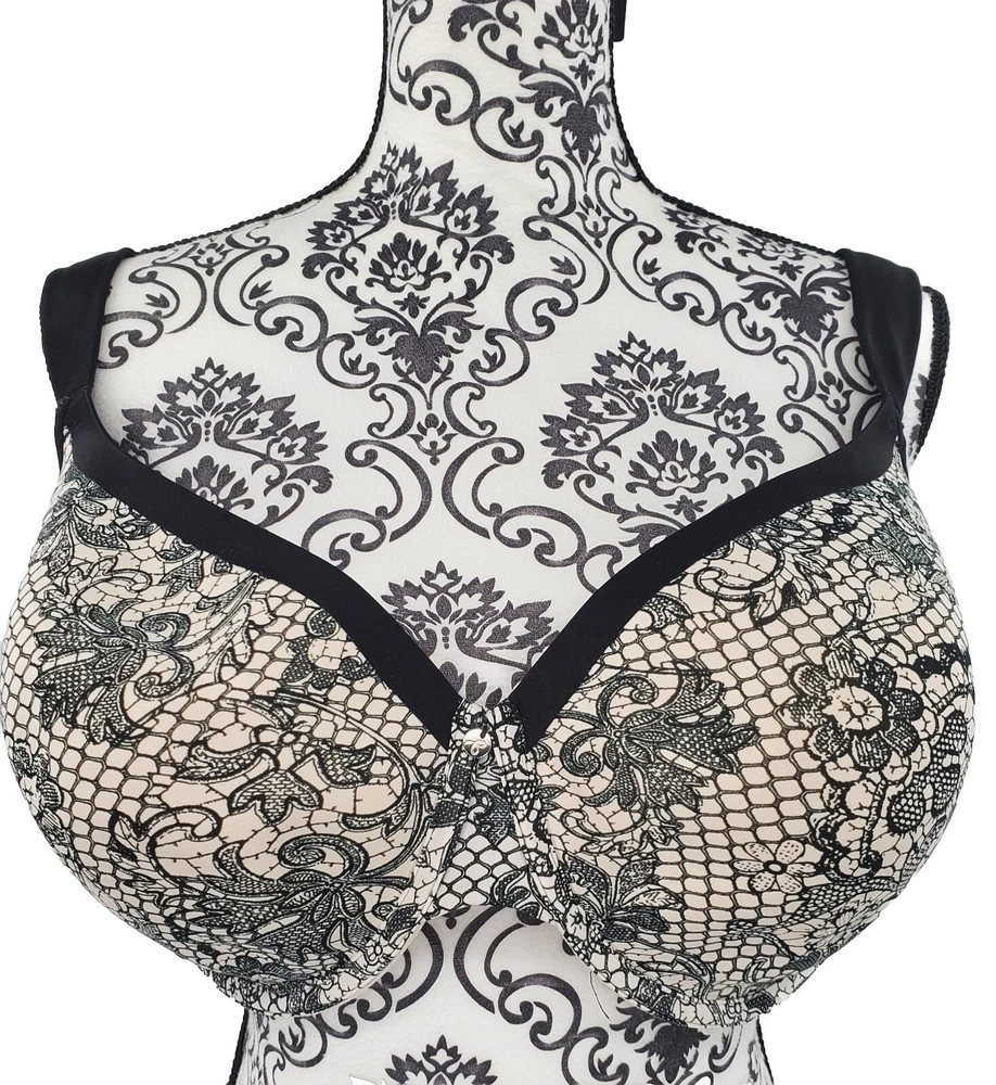 Cacique Lightly Padded Wireless Black & Beige Paisley Floral Print Size 46D Nice. The cups are lightly padded, with a black and beige floral paisley pattern and underwires.