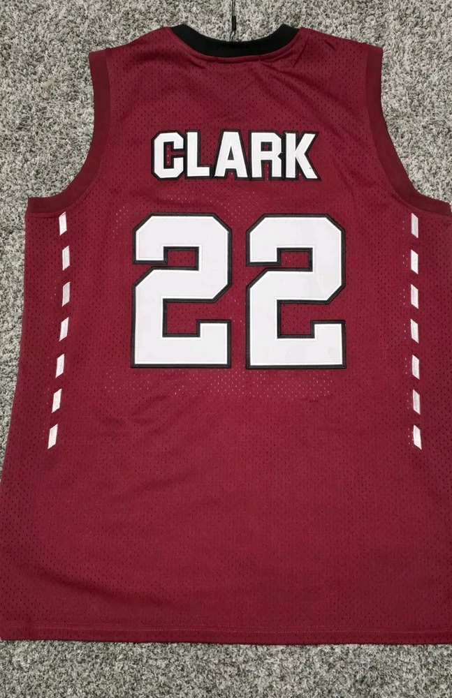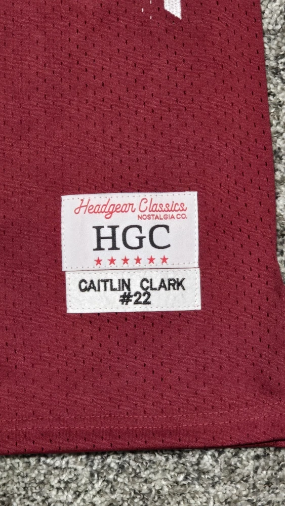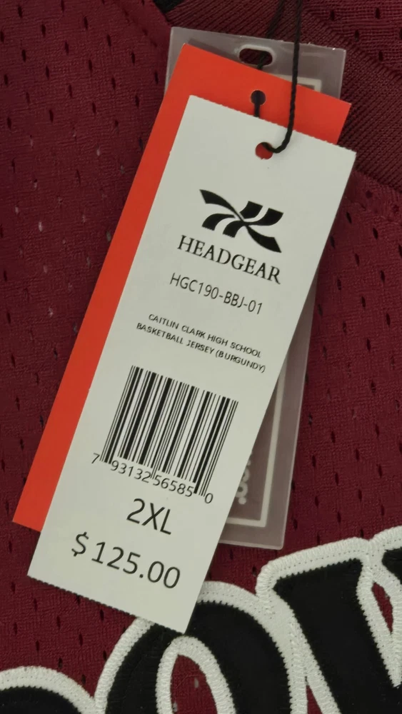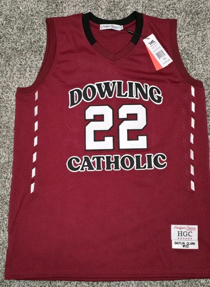 The product is a red Dowling Catholic High School basketball jersey in size XXL, featuring Caitlin Clark's name and number 2X for the Headgear Classic. It is designed for fans of the basketball team to show their support for the player and school during games.