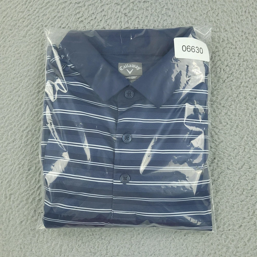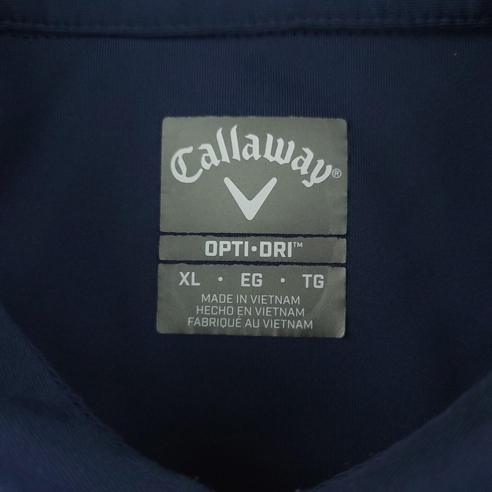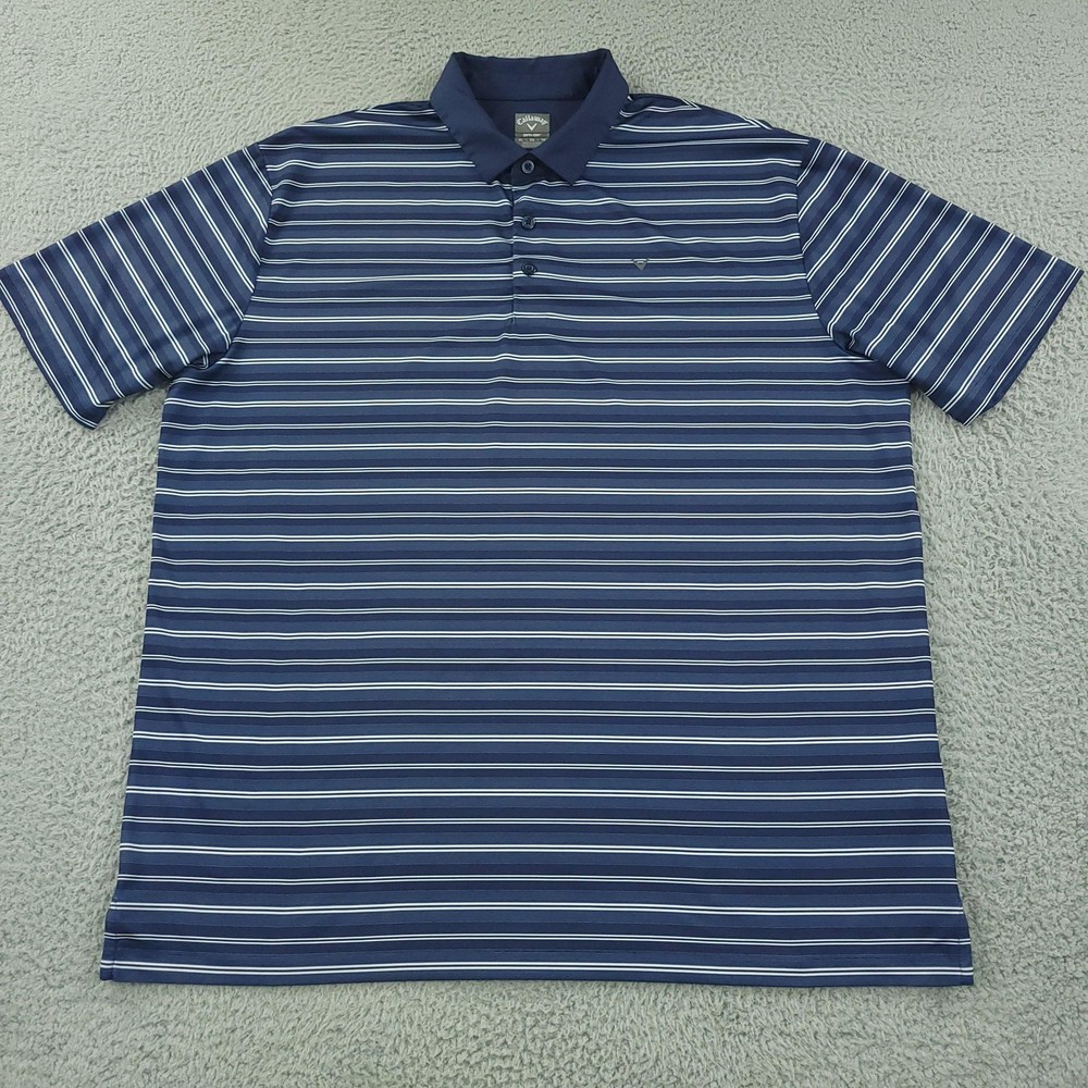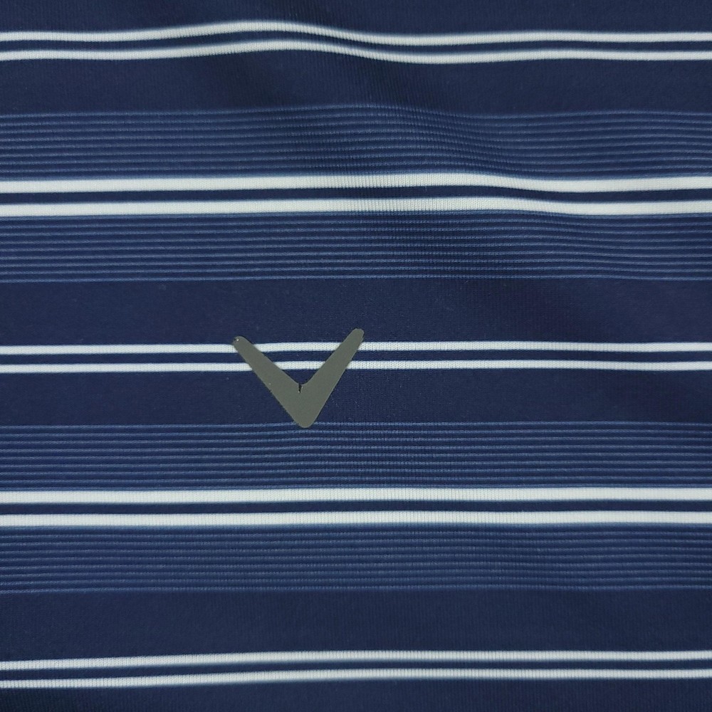 Brand: Callaway Style: Mens short-sleeve polo shirt with horizontal blue and white stripe pattern and classic knit collar. Technology: Opti-Dri moisture-wicking fabric designed to keep you cool and dry during golf and other activities. Color: Navy blue base with white and light blue stripes. Size on tag: XL (Mens). Materials: 90% polyester, 10% elastane for comfortable stretch performance. Country of manufacture: Made in Vietnam. Tag details: Manufactured for Perry Ellis Europe LTD; RN# 37763, CA# 55972, code SU30955. Details: Three-button front placket, Callaway chevron logo at left chest, lightweight performance knit fabric suitable for golf or casual wear. Washed and dried with Fragrance Free Detergent & Dryer Sheets. Measurements are included in the photos, compare measurements with your item to ensure proper fit. (Measurements are done with the item lying flat). I ship next business day and all items include tracking. Items are added daily to my store Visit My Store Buy More & Save! Combined shipping for US customers - $1.99 for each additional item (Add items to shopping cart and discounts will automatically calculate during checkout)